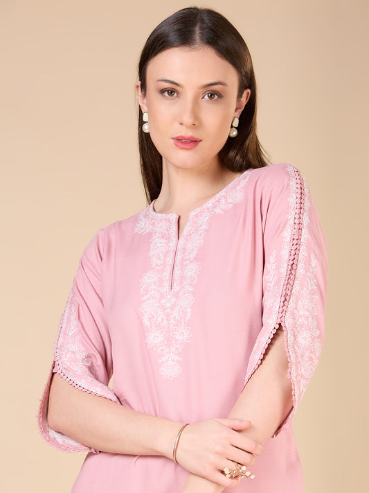 Solid Floral Threadwork Embroidered Straight Fit Kurta...
