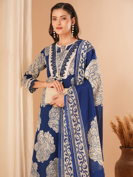 Floral Printed & Embroidered A-Line Kurta with...
