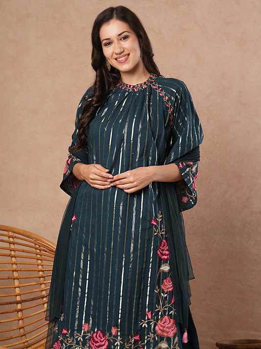 Floral Resham Embroidered & Lurex Striped Kurta...