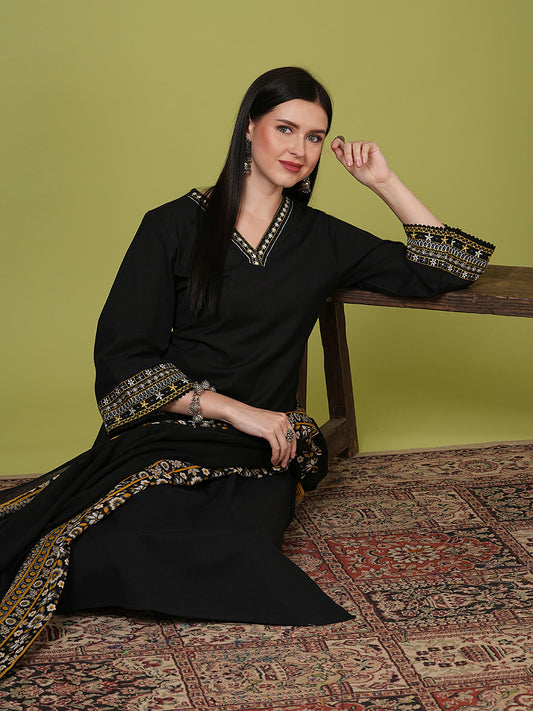MRP (Inclusive of all taxes)Regular price ₹ 2,149.00₹ 2,149.00 Regular priceUnit price / per₹ 5,399.00Sale priceM L XL 2XL 3XL add to cartSale{"id":7577843073110,"title":"Solid Ethnic Embroidered Straight Fit Kurta with Pant and Dupatta - Black","handle":"solid-ethnic-embroidered-straight-fit-kurta-with-pant-and-dupatta-black","description":"\u003ch1\u003eHighlights\u003cbr\u003e\n\u003c\/h1\u003e\n\u003cp\u003e\u003cbr\u003e-Elevate your festive wardrobe with this exquisite Black Solid Ethnic Embroidered Straight Fit Kurta Set. Crafted from premium cotton, the ensemble features a straight-cut kurta adorned with delicate ethnic embroidery along the neckline, exuding timeless elegance. The accompanying solid black pant offers a sleek silhouette, while the matching dupatta showcases an embroidered border, adding a touch of sophistication. Flared sleeves with intricate embroidery at the hemline complete this ensemble, making it a perfect choice for celebratory occasions. Pair with statement jewelry and heels to enhance your festive look.\u003c\/p\u003e\n\u003ch1\u003eFabric \u0026amp; Colour\u003c\/h1\u003e\n\u003cp\u003e\u003cbr\u003eTop Colour: Black\u003cbr\u003eTop Fabric: Cotton\u003cbr\u003eBottom Colour: Black\u003cbr\u003eBottom Fabric: Cotton Blend\u003cbr\u003eDupatta Colour: Black\u003cbr\u003eDupatta Fabric: Pure Cotton\u003c\/p\u003e\n\u003ch1\u003eSpecifications\u003c\/h1\u003e\n\u003cp\u003e\u003cbr\u003eTop Design: Solid\u003cbr\u003eTop Craft: Embroidery, Plain and Prints\u003cbr\u003eTop Shape: Straight\u003cbr\u003eNeck: V-Neck\u003cbr\u003eSleeve Length: Three-Quarter Sleeves\u003cbr\u003eTop Length: Calf Length\u003cbr\u003eHemline: Straight\u003cbr\u003eSlit: Side Slits\u003c\/p\u003e\n\u003cp\u003eBottom Type: Trousers\u003cbr\u003eBottom Closure: Slip-On\u003cbr\u003eWaistband: Partially Elasticated\u003c\/p\u003e\n\u003cp\u003eDupatta Pattern: Embroidered, Solid\u003cbr\u003eDupatta Border: Solid\u003c\/p\u003e\n\u003cp\u003eWash Care: Hand Wash\u003c\/p\u003e\n\u003cp\u003eLength (in inches)\u003cbr\u003eKurta – 44, Sleeves – 18,\u003cbr\u003eBottom – 42\u003c\/p\u003e\n\u003cp\u003eModel’s Height: 5’7”. Wearing Size S.\u003c\/p\u003e\n\u003ch1\u003eProduct Information\u003c\/h1\u003e\n\u003cp\u003e\u003cbr\u003eManufactured\/Packed\/Marketed By:\u003cbr\u003eFashor Lifestyle Pvt. Ltd.\u003cbr\u003e28\/30, Sudarshanpura Industrial Area,\u003cbr\u003eJaipur - 302006.\u003cbr\u003eCountry of Origin: India\u003c\/p\u003e","published_at":"2025-06-21T14:45:36+05:30","created_at":"2025-06-21T12:21:34+05:30","vendor":"FASHOR","type":"3P Kurta Set","tags":["2001-3000","2XL","31193","All Styles","casualwear","colour_black","craft_embroidery","craft_plain-and-prints","design_solid","fabric_cotton","festivewear","KURTI","kurtis","M","meta-size-chart-","now-trending","shape_straight","workwear"],"price":214900,"price_min":214900,"price_max":214900,"available":true,"price_varies":false,"compare_at_price":539900,"compare_at_price_min":539900,"compare_at_price_max":539900,"compare_at_price_varies":false,"variants":[{"id":42408959115350,"title":"M","option1":"M","option2":null,"option3":null,"sku":"38-ST031193E5FS","requires_shipping":true,"taxable":false,"featured_image":{"id":34590343561302,"product_id":7577843073110,"position":3,"created_at":"2025-06-21T12:22:22+05:30","updated_at":"2025-06-21T12:22:53+05:30","alt":null,"width":1080,"height":1440,"src":"\/\/fashor.com\/cdn\/shop\/files\/31221_8.jpg?v=1750488773","variant_ids":[42408959115350,42408959148118,42408959180886,42408959213654,42408959246422]},"available":true,"name":"Solid Ethnic Embroidered Straight Fit Kurta with Pant and Dupatta - Black - M","public_title":"M","options":["M"],"price":214900,"weight":0,"compare_at_price":539900,"inventory_quantity":2,"inventory_management":"shopify","inventory_policy":"deny","barcode":"","featured_media":{"alt":null,"id":26882641723478,"position":3,"preview_image":{"aspect_ratio":0.75,"height":1440,"width":1080,"src":"\/\/fashor.com\/cdn\/shop\/files\/31221_8.jpg?v=1750488773"}},"requires_selling_plan":false,"selling_plan_allocations":[],"quantity_rule":{"min":1,"max":null,"increment":1}},{"id":42408959148118,"title":"L","option1":"L","option2":null,"option3":null,"sku":"40-ST031193E5FS","requires_shipping":true,"taxable":false,"featured_image":{"id":34590343561302,"product_id":7577843073110,"position":3,"created_at":"2025-06-21T12:22:22+05:30","updated_at":"2025-06-21T12:22:53+05:30","alt":null,"width":1080,"height":1440,"src":"\/\/fashor.com\/cdn\/shop\/files\/31221_8.jpg?v=1750488773","variant_ids":[42408959115350,42408959148118,42408959180886,42408959213654,42408959246422]},"available":false,"name":"Solid Ethnic Embroidered Straight Fit Kurta with Pant and Dupatta - Black - L","public_title":"L","options":["L"],"price":214900,"weight":0,"compare_at_price":539900,"inventory_quantity":0,"inventory_management":"shopify","inventory_policy":"deny","barcode":"","featured_media":{"alt":null,"id":26882641723478,"position":3,"preview_image":{"aspect_ratio":0.75,"height":1440,"width":1080,"src":"\/\/fashor.com\/cdn\/shop\/files\/31221_8.jpg?v=1750488773"}},"requires_selling_plan":false,"selling_plan_allocations":[],"quantity_rule":{"min":1,"max":null,"increment":1}},{"id":42408959180886,"title":"XL","option1":"XL","option2":null,"option3":null,"sku":"42-ST031193E5FS","requires_shipping":true,"taxable":false,"featured_image":{"id":34590343561302,"product_id":7577843073110,"position":3,"created_at":"2025-06-21T12:22:22+05:30","updated_at":"2025-06-21T12:22:53+05:30","alt":null,"width":1080,"height":1440,"src":"\/\/fashor.com\/cdn\/shop\/files\/31221_8.jpg?v=1750488773","variant_ids":[42408959115350,42408959148118,42408959180886,42408959213654,42408959246422]},"available":false,"name":"Solid Ethnic Embroidered Straight Fit Kurta with Pant and Dupatta - Black - XL","public_title":"XL","options":["XL"],"price":214900,"weight":0,"compare_at_price":539900,"inventory_quantity":0