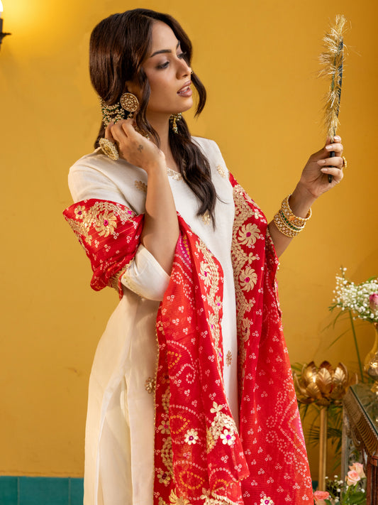 MRP (Inclusive of all taxes)Regular price ₹ 4,599.00₹ 4,599.00 Regular priceUnit price / per₹ 4,599.00Sale priceS M L XL 2XL add to cart{"id":7605701050454,"title":"Solid Gota Patti Embroidered Straight Fit Kurta with Pant and Bandhani Printed Dupatta - Off White","handle":"solid-gota-patti-embroidered-straight-fit-kurta-with-pant-and-bandhani-printed-dupatta-off-white","description":"\u003ch1\u003eHighlights\u003c\/h1\u003e\n\u003cp\u003e\u003cbr\u003e\u003cbr\u003e-Radiate understated elegance in this off-white straight-fit kurta, crafted from airy Kota Doria fabric with a flattering V-neckline and intricate Gota Patti embroidery on the front. Paired with a solid pant and a vibrant Bandhani printed dupatta, this ensemble blends traditional artistry with modern grace—perfect for festive mornings or cultural gatherings\u003c\/p\u003e\n\u003ch1\u003e\n\u003cbr\u003eFabric \u0026amp; Colour\u003c\/h1\u003e\n\u003cp\u003e\u003cbr\u003eTop Colour: Off White\u003cbr\u003eTop Fabric: Supernet\u003cbr\u003eBottom Colour: Off White\u003cbr\u003eBottom Fabric: Cotton Blend\u003cbr\u003eDupatta Colour: Red\u003cbr\u003eDupatta Fabric: Supernet\u003c\/p\u003e\n\u003ch1\u003eSpecifications\u003c\/h1\u003e\n\u003cp\u003e\u003cbr\u003eTop Design: Solid\u003cbr\u003eTop Craft: Gota patti\u003cbr\u003eTop Shape: Straight\u003cbr\u003eNeck: V-Neck\u003cbr\u003eSleeve Length: Three-Quarter Sleeves\u003cbr\u003eTop Length: Knee Length\u003cbr\u003eHemline: Straight\u003cbr\u003eSlit: Side Slits\u003c\/p\u003e\n\u003cp\u003eBottom Type: Trousers\u003cbr\u003eBottom Closure: Slip-On\u003cbr\u003eWaistband: Partially Elasticated\u003c\/p\u003e\n\u003cp\u003eDupatta Pattern: Embroidered, Printed\u003cbr\u003eDupatta Border: Printed\u003c\/p\u003e\n\u003cp\u003eWash Care: Hand Wash\u003c\/p\u003e\n\u003cp\u003eLength (in inches)\u003cbr\u003eKurta – 44, Sleeves – 15,\u003cbr\u003eBottom – 40\u003c\/p\u003e\n\u003cp\u003eModel’s Height: 5’7”. Wearing Size S.\u003c\/p\u003e\n\u003ch1\u003eProduct Information\u003c\/h1\u003e\n\u003cp\u003e\u003cbr\u003eManufactured\/Packed\/Marketed By:\u003cbr\u003eFashor Lifestyle Pvt. Ltd.\u003cbr\u003e28\/30, Sudarshanpura Industrial Area,\u003cbr\u003eJaipur - 302006.\u003cbr\u003eCountry of Origin: India\u003c\/p\u003e","published_at":"2025-07-30T18:04:28+05:30","created_at":"2025-07-30T17:30:30+05:30","vendor":"FASHOR","type":"3P Kurta Set","tags":["31071","above-3000","All Styles","casualwear","colour_white","craft_gota-patti","design_solid","fabric_supernet","festivewear","KURTI","kurtis","L","meta-size-chart-","now-trending","rakhi","rakhi-favourites","S","shape_straight","XL"],"price":459900,"price_min":459900,"price_max":459900,"available":true,"price_varies":false,"compare_at_price":459900,"compare_at_price_min":459900,"compare_at_price_max":459900,"compare_at_price_varies":false,"variants":[{"id":42535192199254,"title":"S","option1":"S","option2":null,"option3":null,"sku":"36-ST031071E5OS","requires_shipping":true,"taxable":false,"featured_image":{"id":34809927630934,"product_id":7605701050454,"position":3,"created_at":"2025-07-30T17:31:14+05:30","updated_at":"2025-07-30T17:32:11+05:30","alt":null,"width":1080,"height":1440,"src":"\/\/fashor.com\/cdn\/shop\/files\/31625_1.jpg?v=1753876931","variant_ids":[42535192199254,42535192232022,42535192264790,42535192297558,42535192330326]},"available":true,"name":"Solid Gota Patti Embroidered Straight Fit Kurta with Pant and Bandhani Printed Dupatta - Off White - S","public_title":"S","options":["S"],"price":459900,"weight":0,"compare_at_price":459900,"inventory_quantity":1,"inventory_management":"shopify","inventory_policy":"deny","barcode":"","featured_media":{"alt":null,"id":27013157388374,"position":3,"preview_image":{"aspect_ratio":0.75,"height":1440,"width":1080,"src":"\/\/fashor.com\/cdn\/shop\/files\/31625_1.jpg?v=1753876931"}},"requires_selling_plan":false,"selling_plan_allocations":[],"quantity_rule":{"min":1,"max":null,"increment":1}},{"id":42535192232022,"title":"M","option1":"M","option2":null,"option3":null,"sku":"38-ST031071E5OS","requires_shipping":true,"taxable":false,"featured_image":{"id":34809927630934,"product_id":7605701050454,"position":3,"created_at":"2025-07-30T17:31:14+05:30","updated_at":"2025-07-30T17:32:11+05:30","alt":null,"width":1080,"height":1440,"src":"\/\/fashor.com\/cdn\/shop\/files\/31625_1.jpg?v=1753876931","variant_ids":[42535192199254,42535192232022,42535192264790,42535192297558,42535192330326]},"available":false,"name":"Solid Gota Patti Embroidered Straight Fit Kurta with Pant and Bandhani Printed Dupatta - Off White - M","public_title":"M","options":["M"],"price":459900,"weight":0,"compare_at_price":459900,"inventory_quantity":0,"inventory_management":"shopify","inventory_policy":"deny","barcode":"","featured_media":{"alt":null,"id":27013157388374,"position":3,"preview_image":{"aspect_ratio":0.75,"height":1440,"width":1080,"src":"\/\/fashor.com\/cdn\/shop\/files\/31625_1.jpg?v=1753876931"}},"requires_selling_plan":false,"selling_plan_allocations":[],"quantity_rule":{"min":1,"max":null,"increment":1}},{"id":42535192264790,"title":"L","option1":"L","option2":null,"option3":null,"sku":"40-ST031071E5OS","requires_shipping":true,"taxable":false,"featured_image":{"id":34809927630934,"product_id":7605701050454,"position":3,"created_at":"2025-07-30T17:31:14+05:30","updated_at":"2025-07-30T17:32:11+05:30","alt":null,"width":1080,"height":1440,"src":"\/\/fashor.com\/cdn\/shop\/files\/31625_1.jpg?v=1753876931","variant_ids":[42535192199254,42535192232022,42535192264790,42535192297558,42535192330326]},"available":true,"name":"Solid Gota Patti Embroidered Straight Fit Kurta with Pant and Bandhani Printed Dupatta - Off White - L","public_title":"L","options":["L"],"price":459900,"weight":0,"compare_at_price":459900,"inventory_quantity":1,"inventory_management":"shopify","inventory_policy":"deny","barcode":"","featured_media":{"alt":null,"id":27013157388374,"position":3,"preview_i