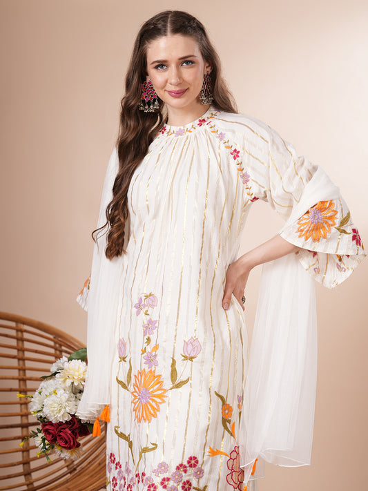 Floral Resham Embroidered & Lurex Striped Kurta...