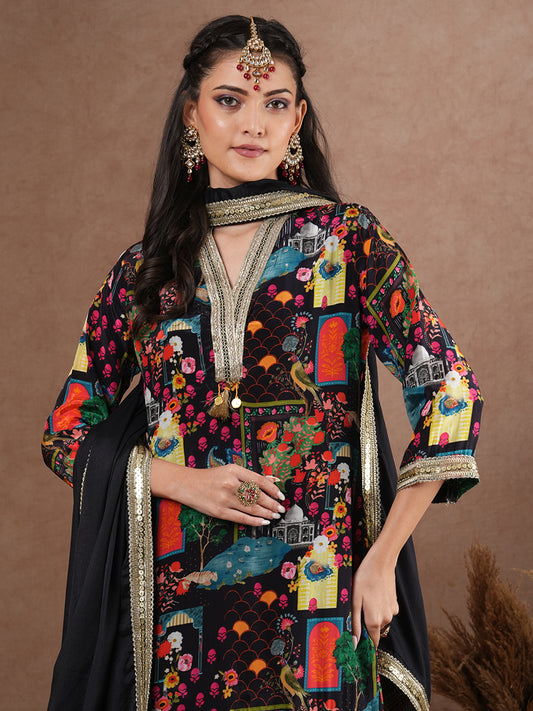 Ethnic Floral Printed & Embroidered Straight Fit...
