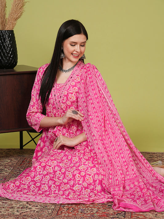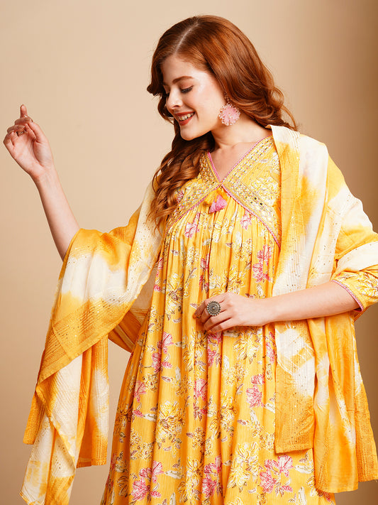 Ethnic Floral Printed & Embroidered A-Line Pleated...