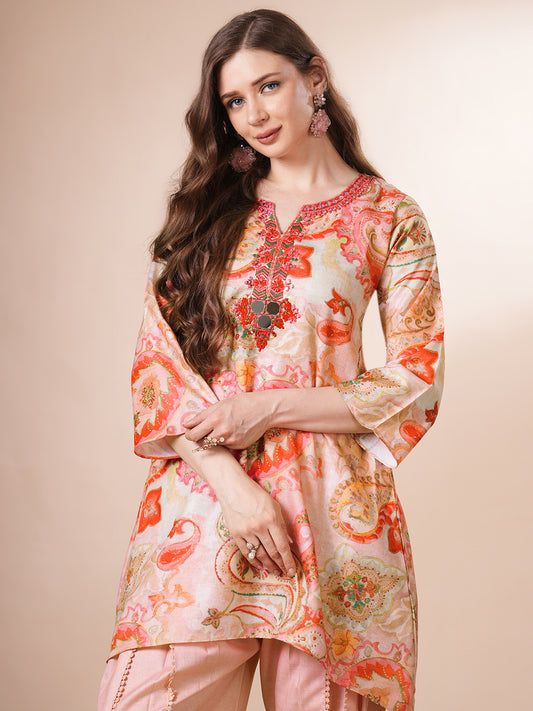 Paisley Printed Embroidered A-Line Kurta with Pant...