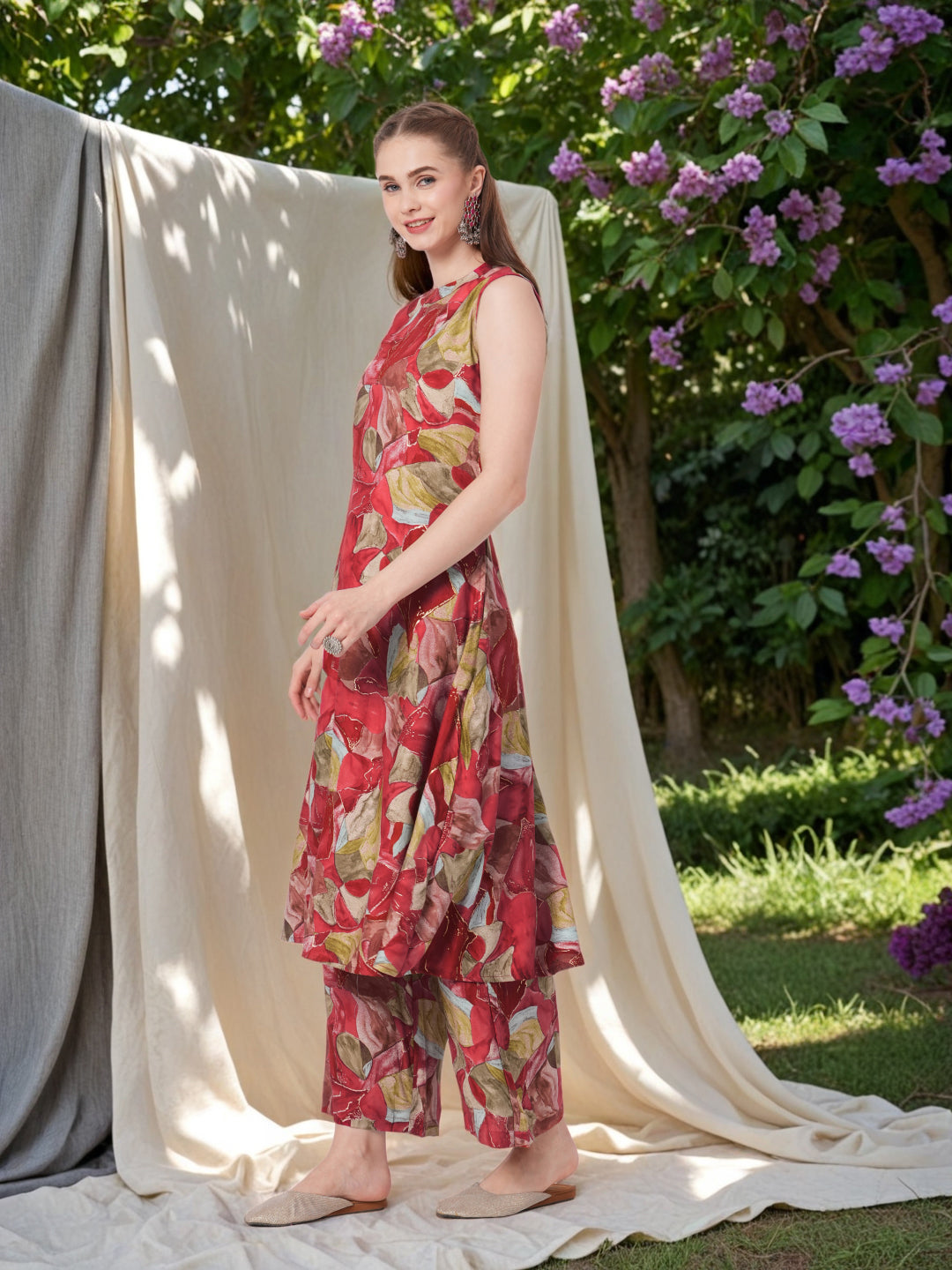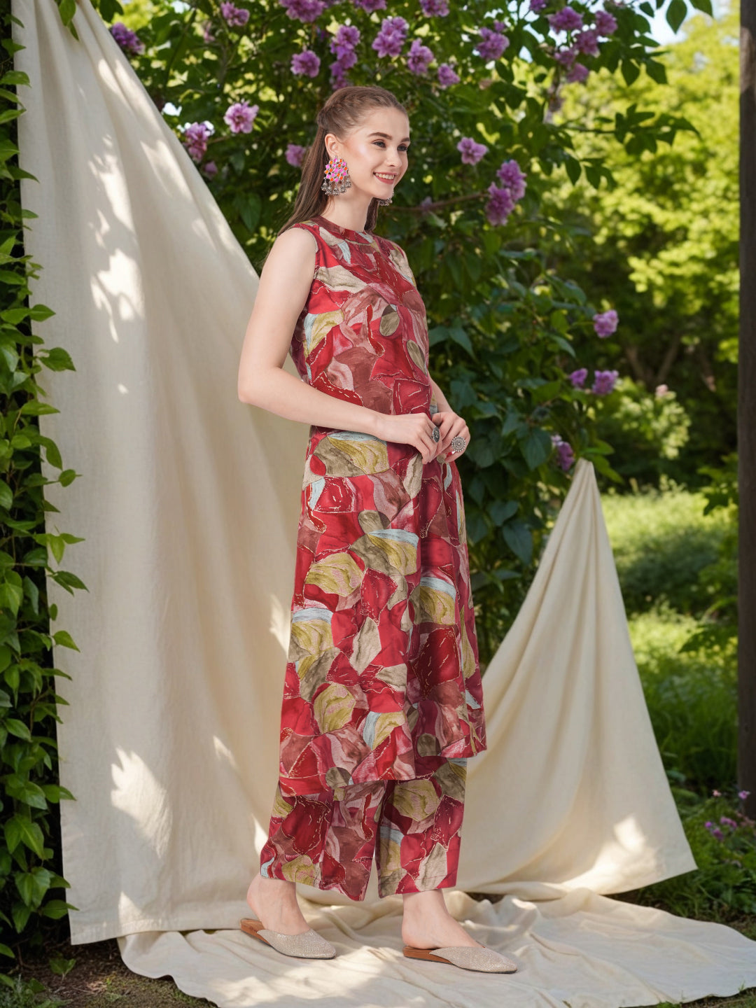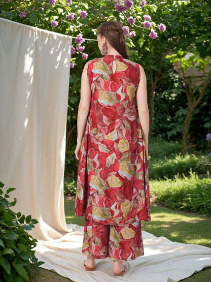 -Step into effortless elegance with the Abstract Floral Foil Printed A-Line Flared Co-ord Set in serene Pink. Made from luxurious viscose rayon, this set combines contemporary floral and abstract prints with a touch of metallic foil for a subtle shine. The flared, calf-length A-line silhouette creates a flattering shape, while the band collar adds a modern twist.Detachable Sleeves inside the Garment. Paired with matching palazzos featuring a partially elasticated drawstring waist, this co-ord set offers both comfort and style for your everyday or office wear. Hand wash for long-lasting beauty and effortless chic..