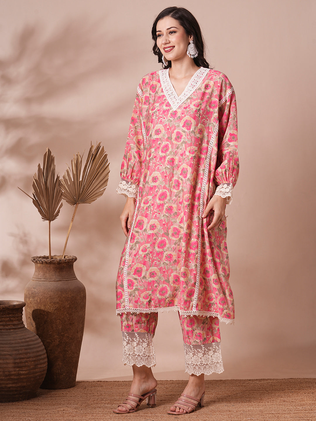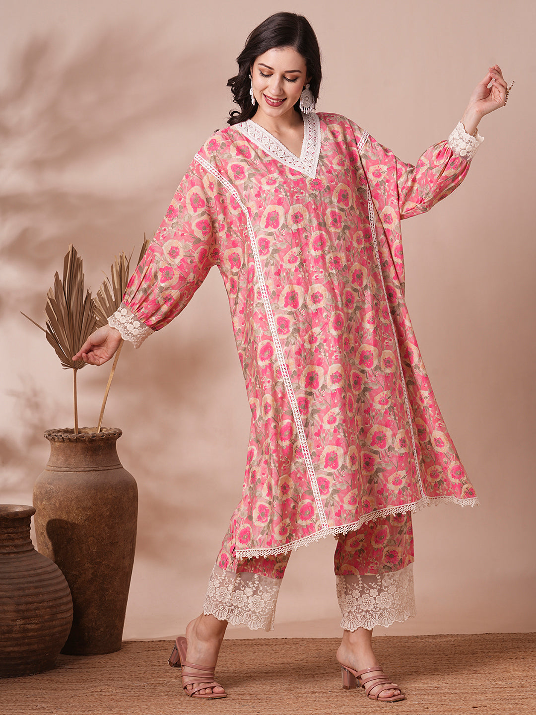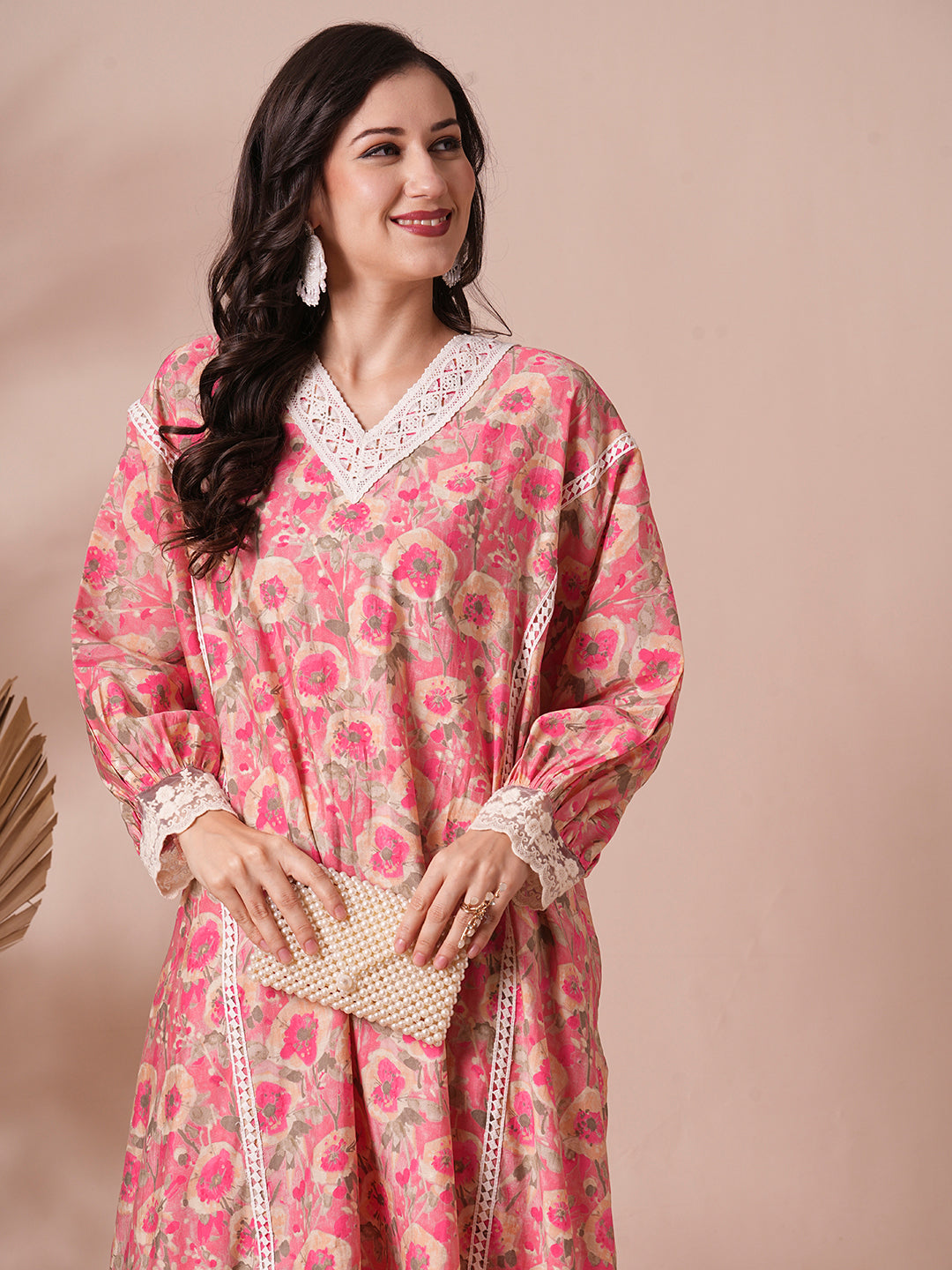 Abstract Floral Foil Printed Kaftan Co-ord Set - Pink