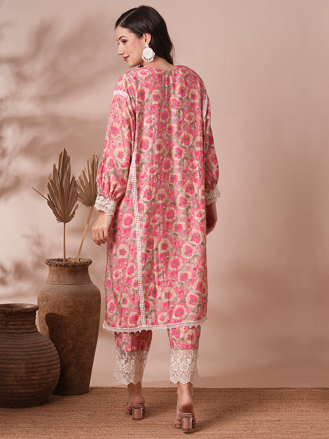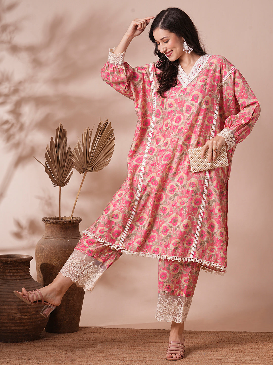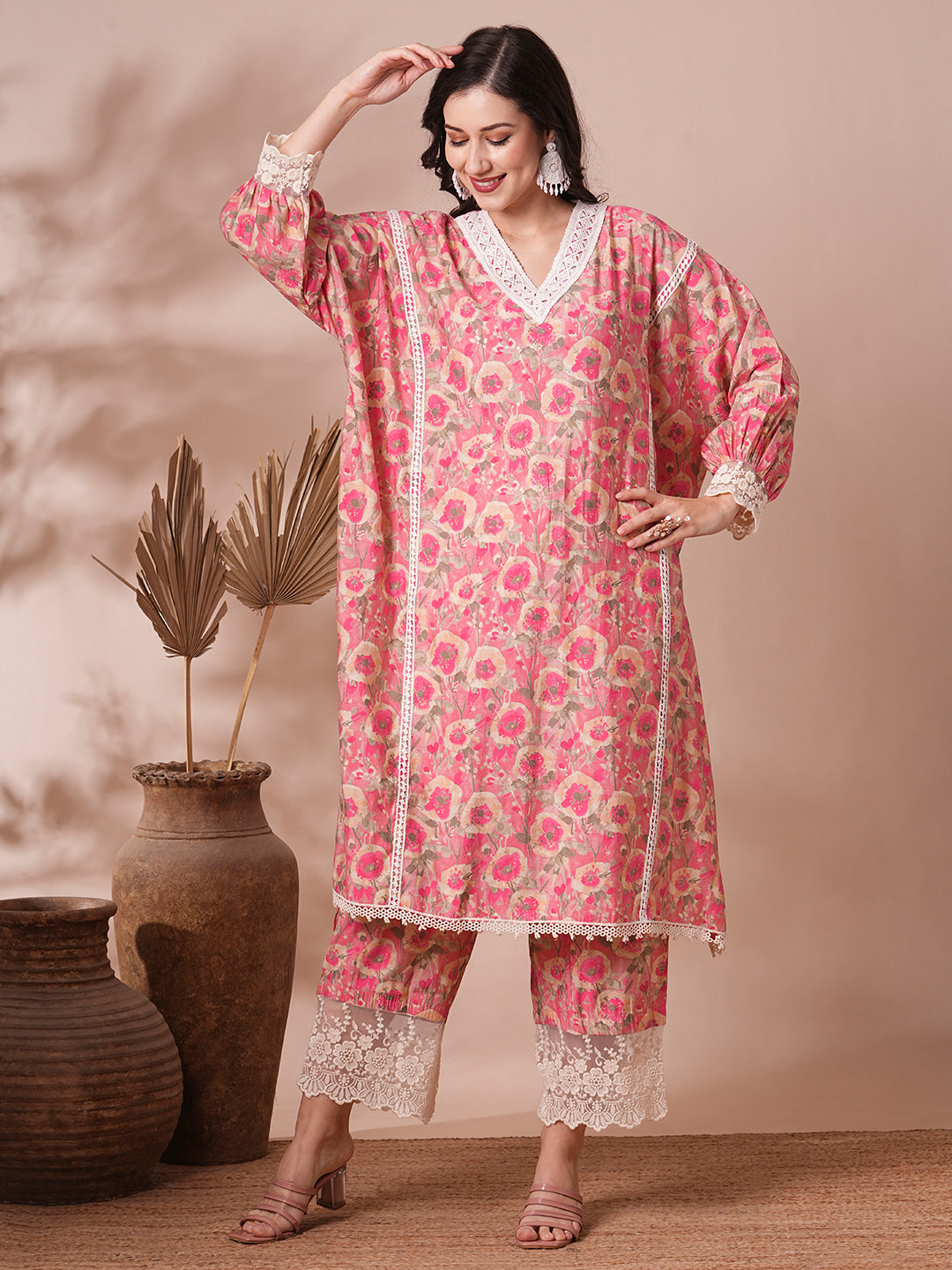 Abstract Floral Foil Printed Kaftan Co-ord Set - Pink