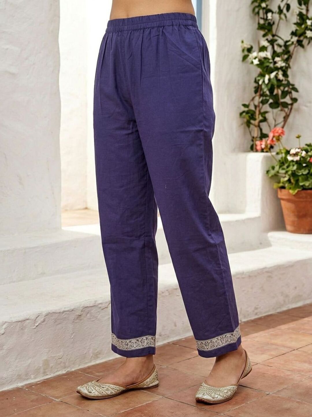 This three-piece cotton suit set features a bold abstract floral jaal print with large off-white blooms set against a rich solid purple base. The straight-cut kurta comes with a V-neckline detailed with soft gathers at the midpoint and finished with hand kantha and subtly highlighted with sequins.