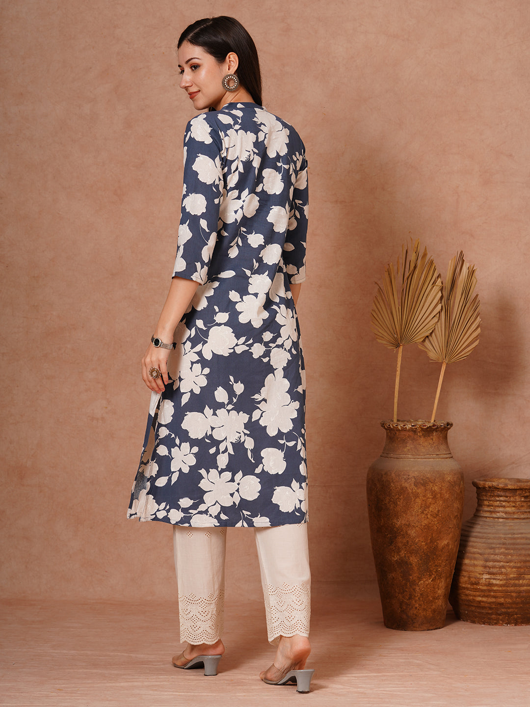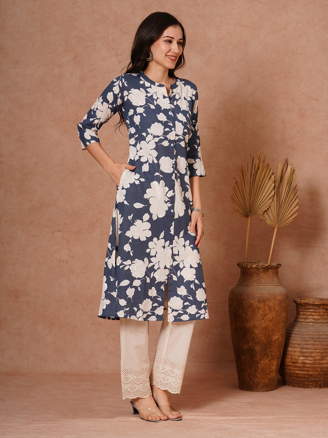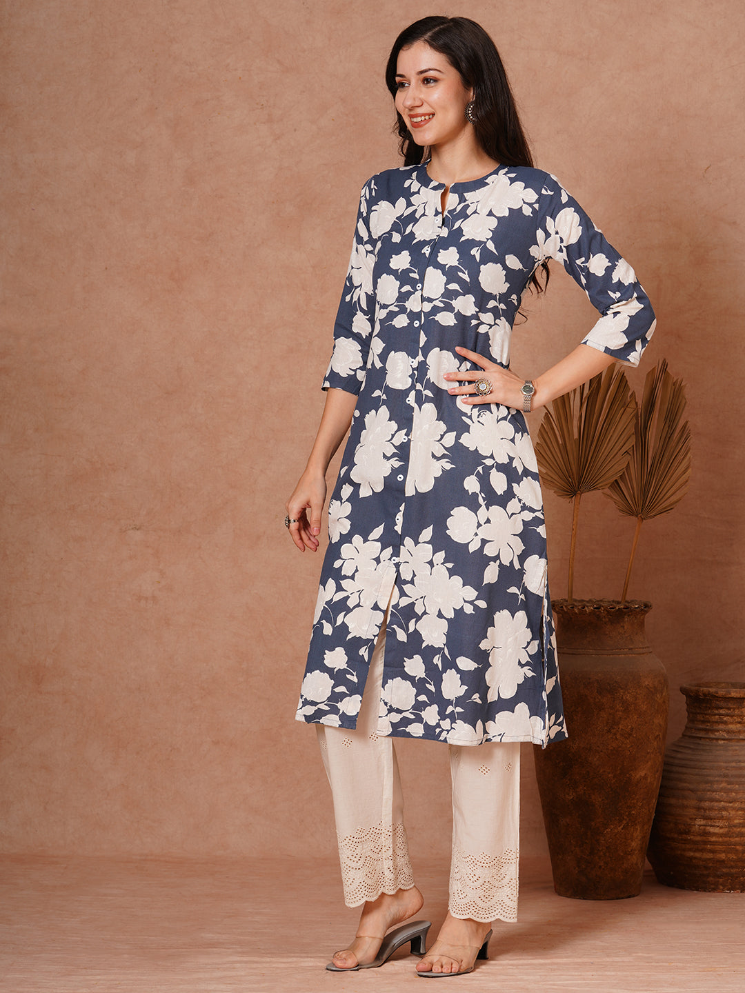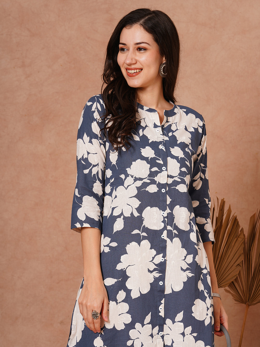 Abstract Floral Printed A-Line Cotton Flax Kurta - Grey