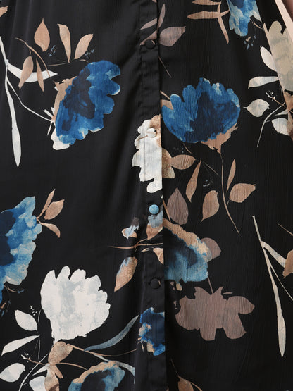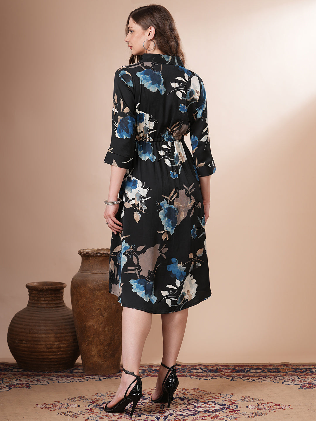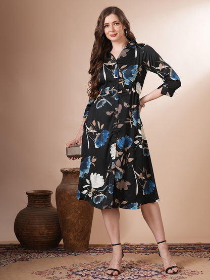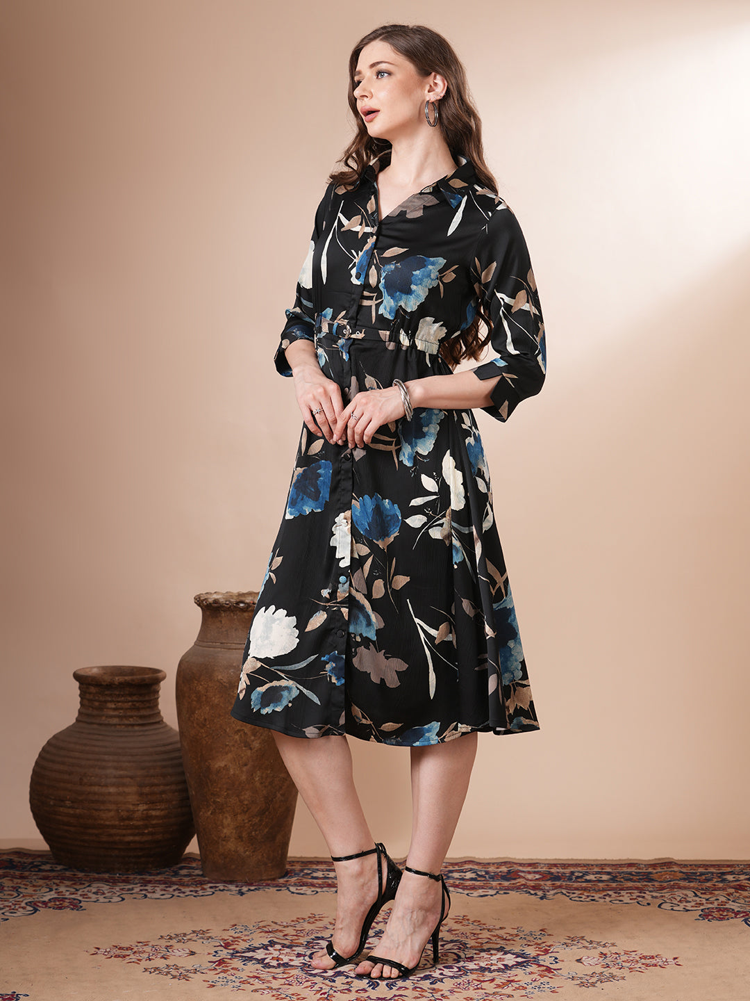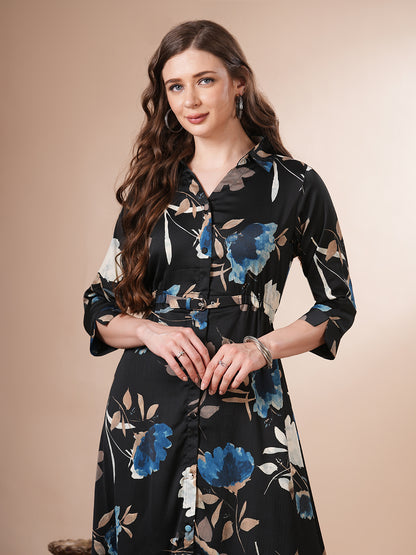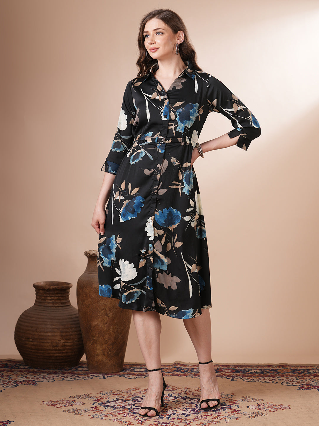Make a bold statement with this Abstract Printed A-Line Flared Midi Dress in Black. Crafted from soft crepe fabric, it features a classic shirt collar, beautiful print highlights, and a flattering flared silhouette. Finished with a matching belt and buckle for a cinched, chic look—perfect for both daytime flair and evening charm.