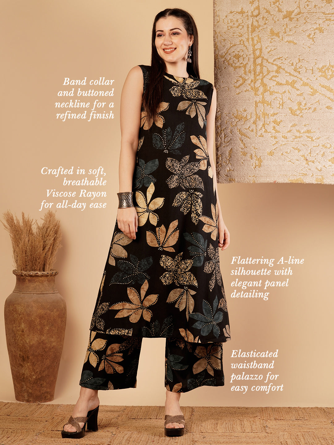 Abstract Floral Printed A-Line Paneled Co-ord Set -Black