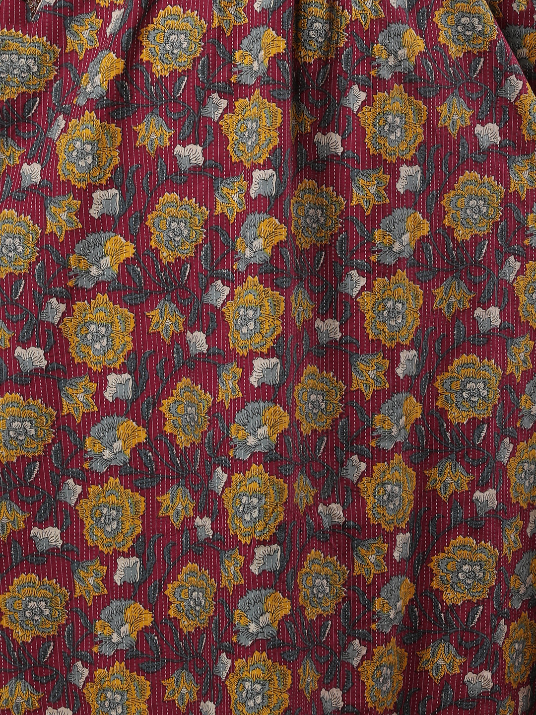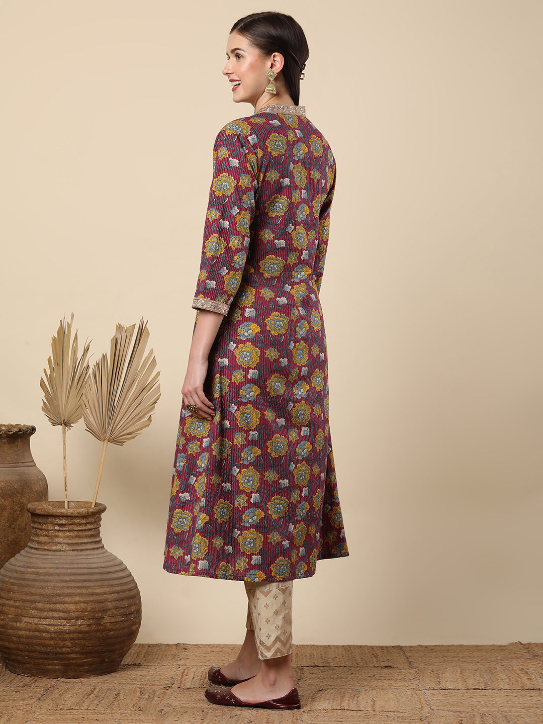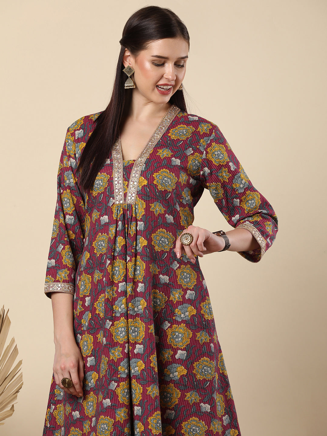Make a statement in subtle sophistication with our Abstract Floral Printed A-Line Pleated Kurta in regal purple. Tailored from textured Kantha-woven fabric, this elegant piece features delicate pleats and an A-line silhouette for graceful movement. The V-neckline is adorned with shimmering sequin and zari detailing, adding a refined touch of sparkle to your everyday or festive wardrobe