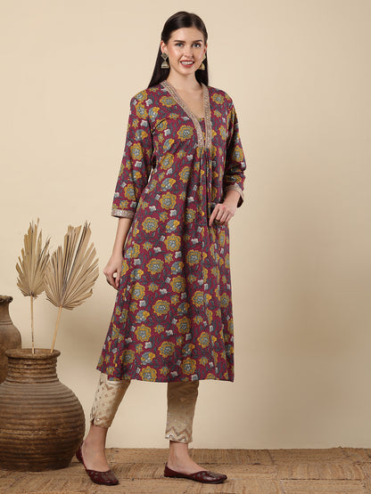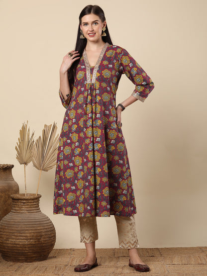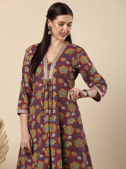 Abstract Floral Printed A-Line Pleated Kurta - Purple