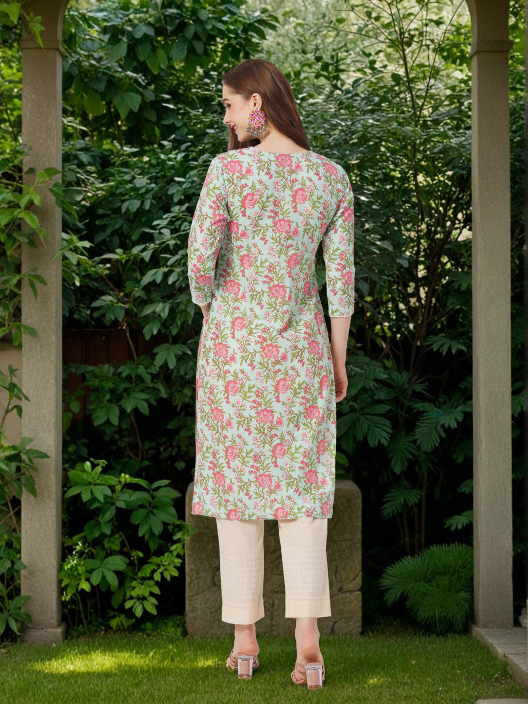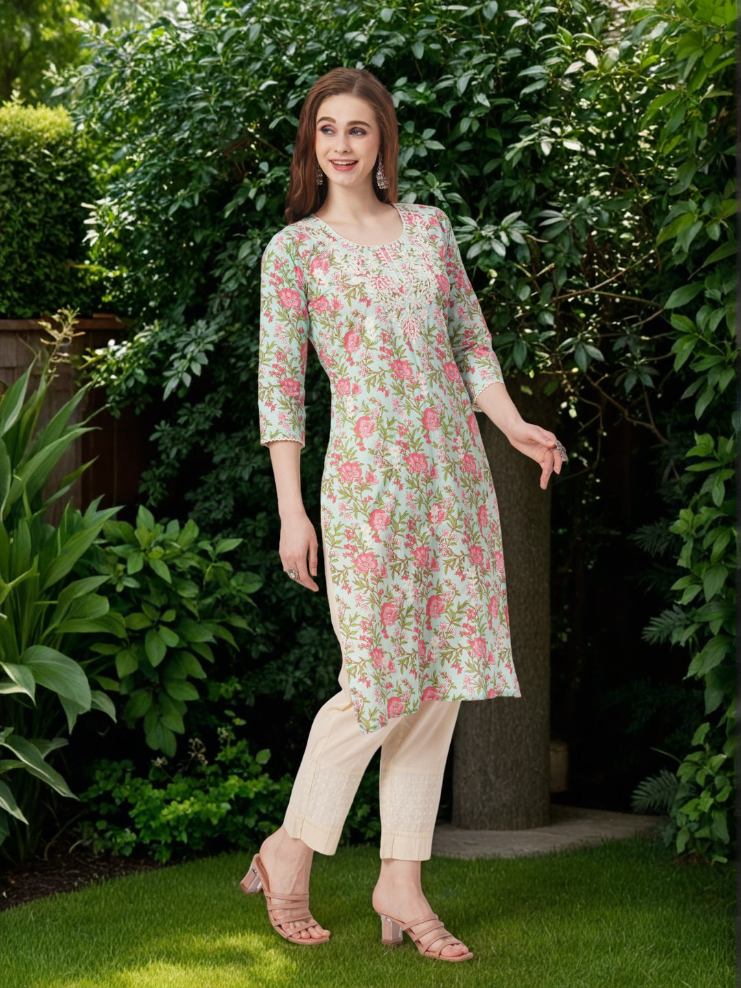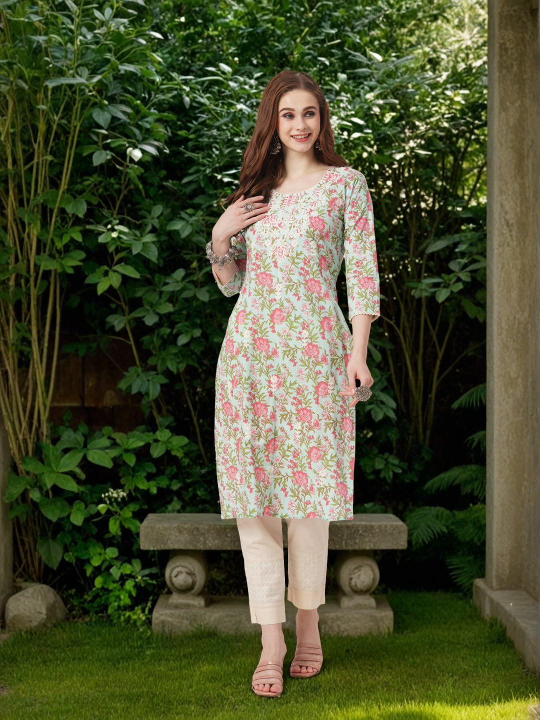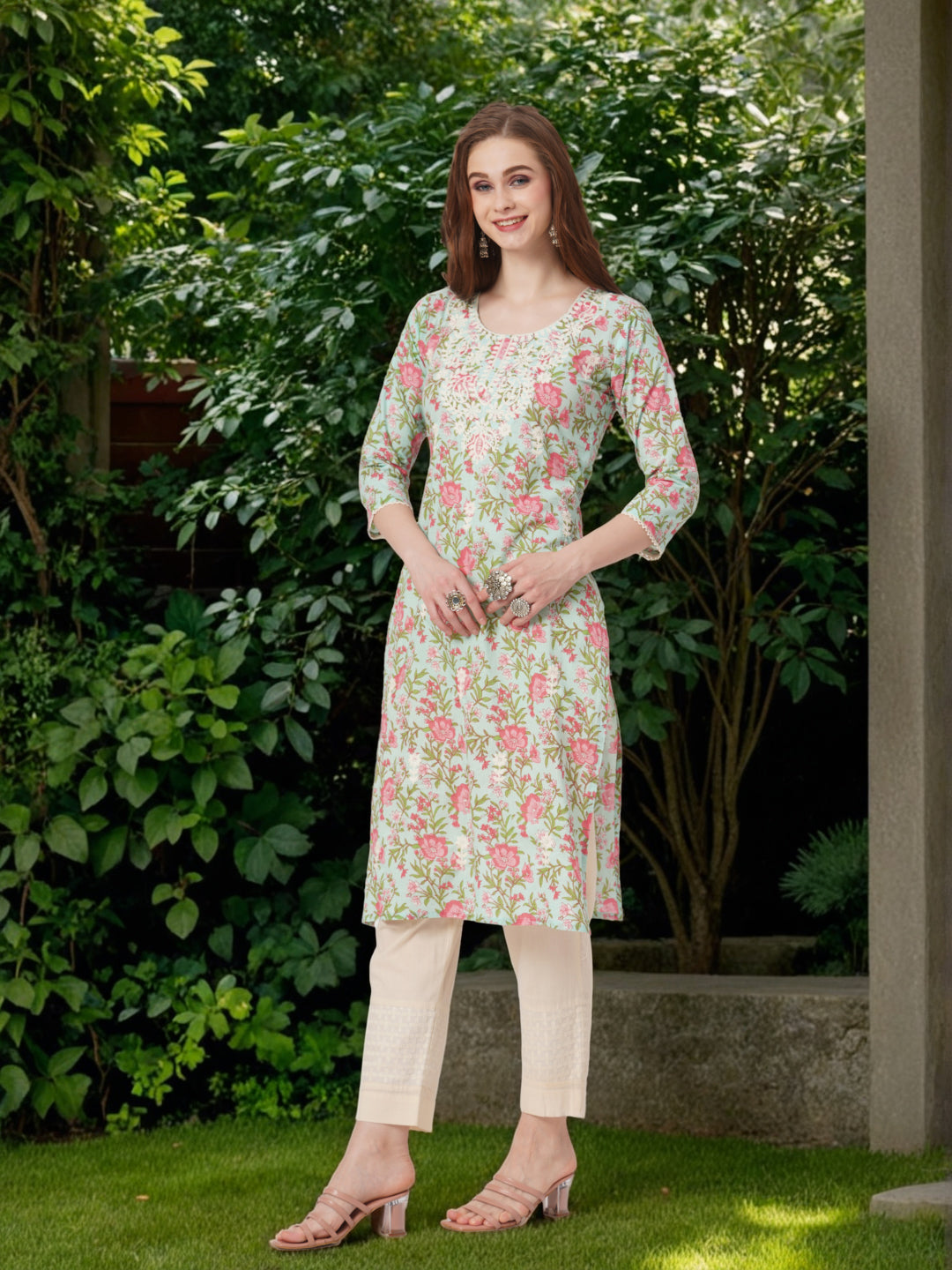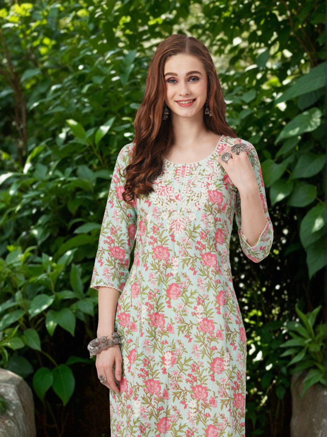 Step into effortless elegance with this Blue Abstract Floral Printed Straight Fit Kurta, crafted from soft, flowy viscose rayon for all-day ease. The graceful straight silhouette flatters every body type while offering a polished, contemporary look. A delicate round neckline adds a touch of understated charm, perfect for everyday wear or special gatherings. The highlight of the piece is its exquisite Chikankari embroidery, bringing in the richness of traditional craftsmanship. Abstract floral prints blend modern artistry with cultural elegance, creating a refined yet vibrant aesthetic. Style it with minimal accessories and straight pants for a chic, timeless ensemble.