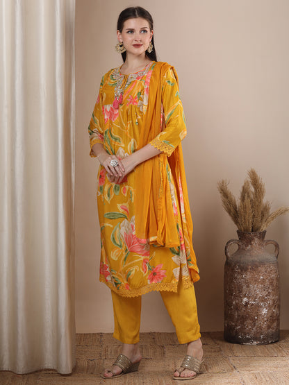Abstract Floral Printed Embroidered A-Line Pleated Kurta with Pant and Dupatta - Mustard