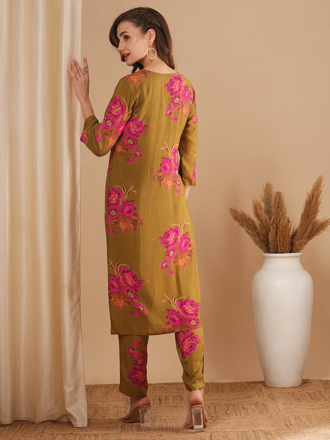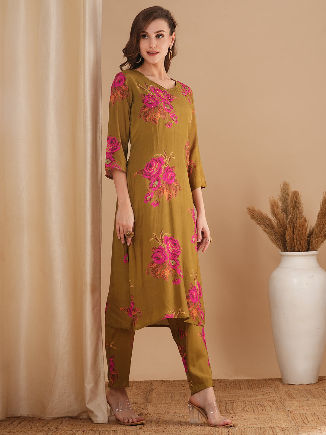 Abstract Floral Printed & Embroidered Straight Fit Kurta with Pant - Olive Green