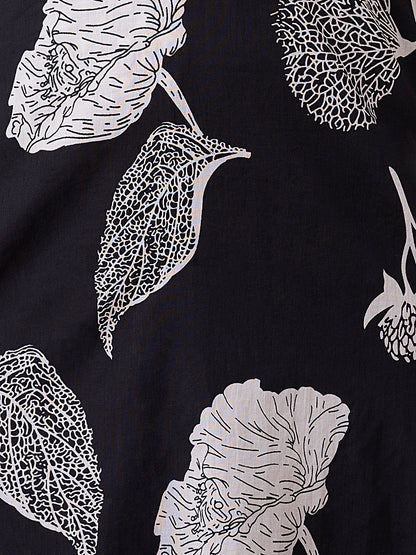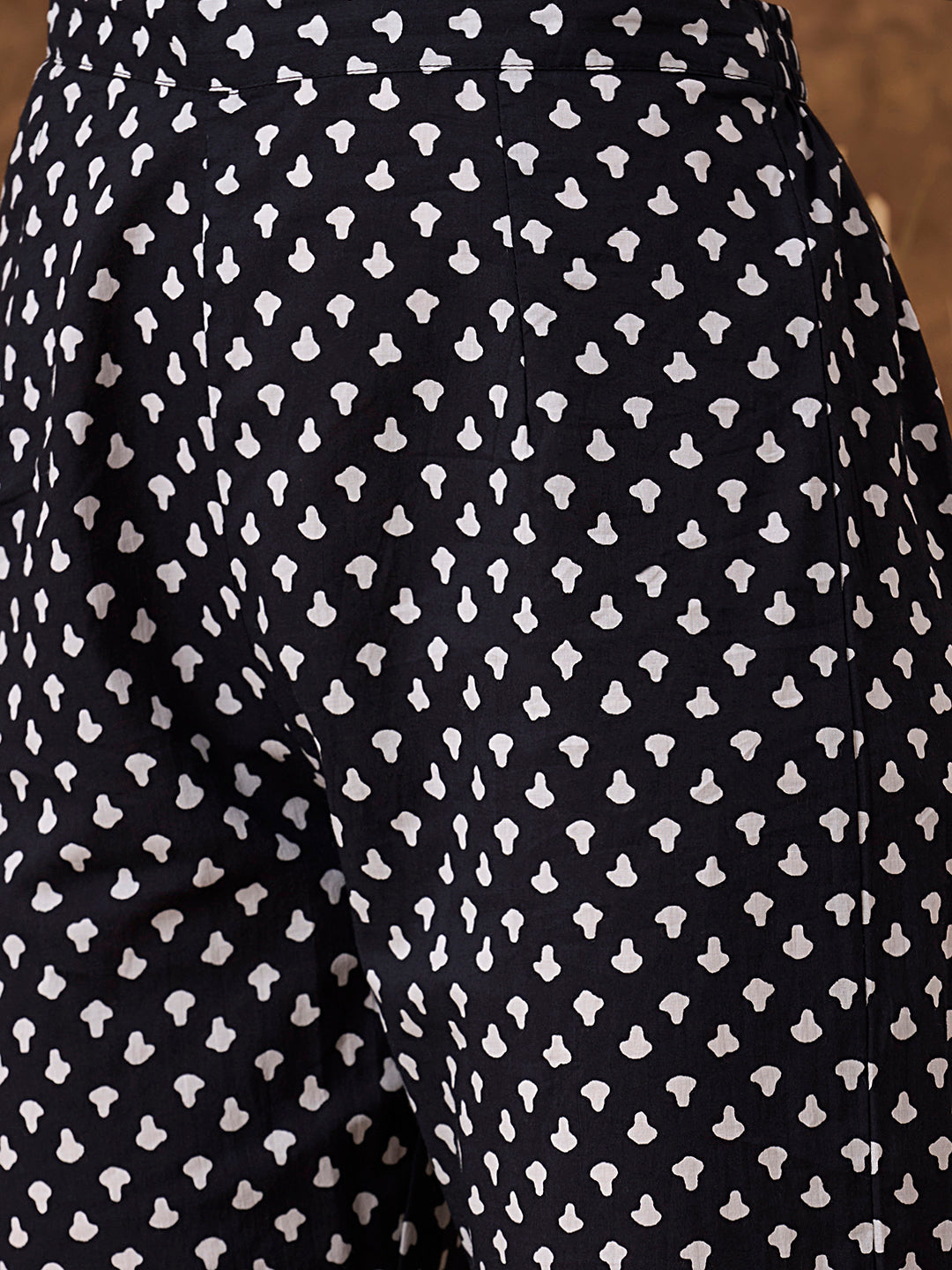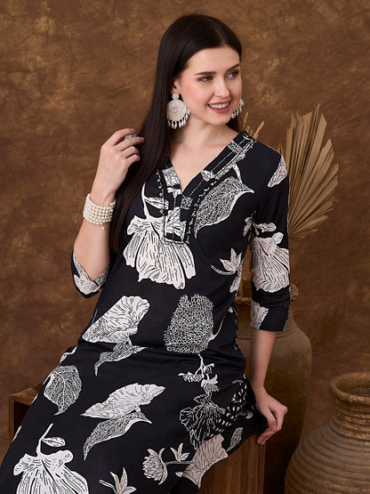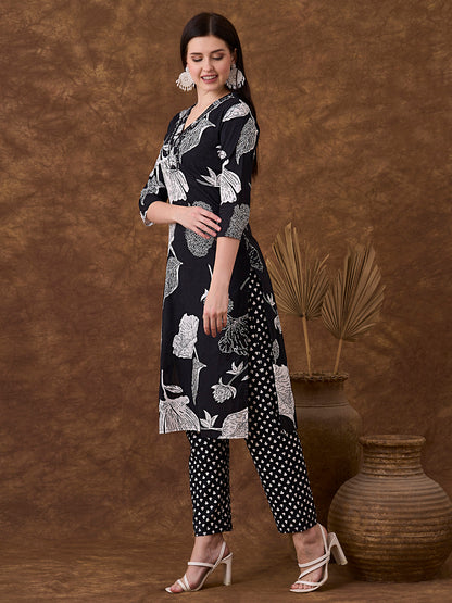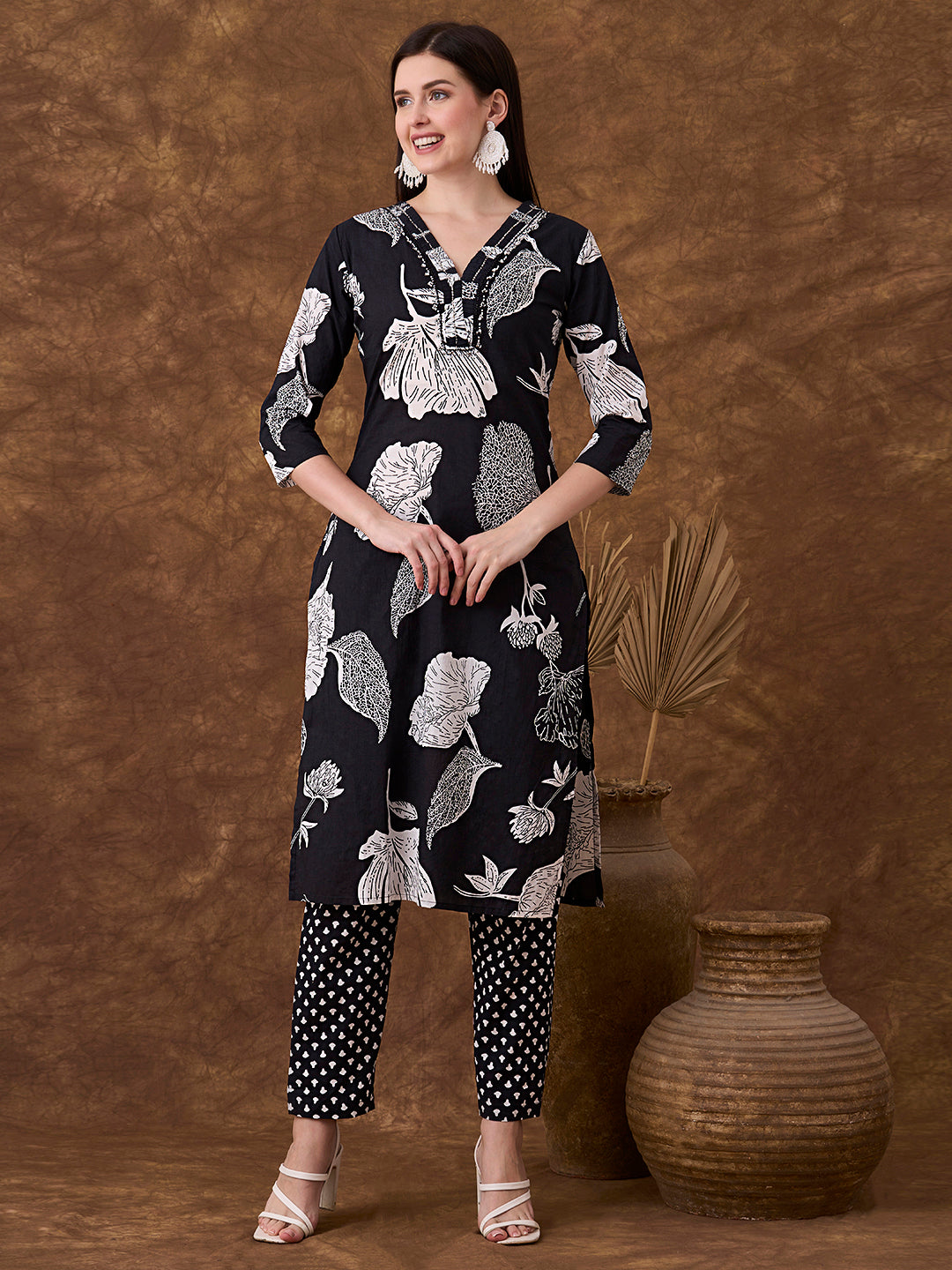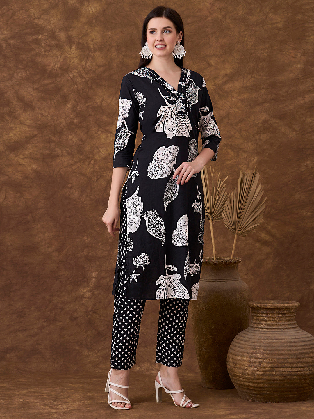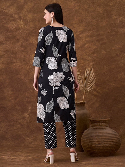 Abstract Floral Printed & Embroidered Straight Kurta with Pant - Black