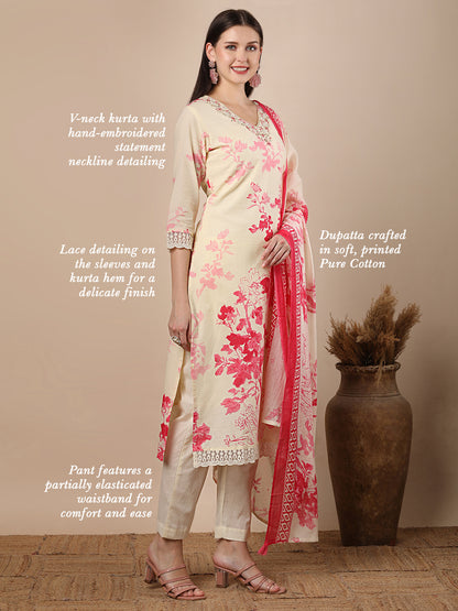 Abstract Floral Printed & Hand Embroidered Straight Fit Kurta with Pant and Dupatta - Cream
