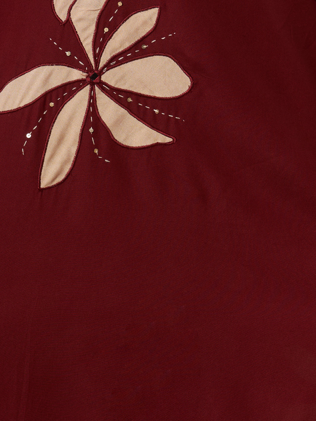 Abstract Floral Printed Kantha Work Straight Fit Co-ord Set - Rust – Made from breezy viscose rayon, this chic set showcases a round neckline with delicate kantha work and sequin highlights, bringing a touch of artisanal elegance to modern style.