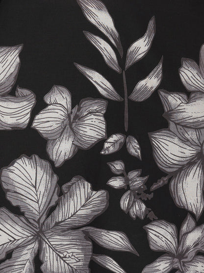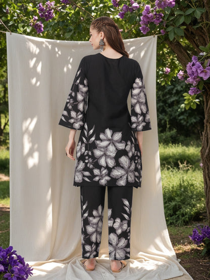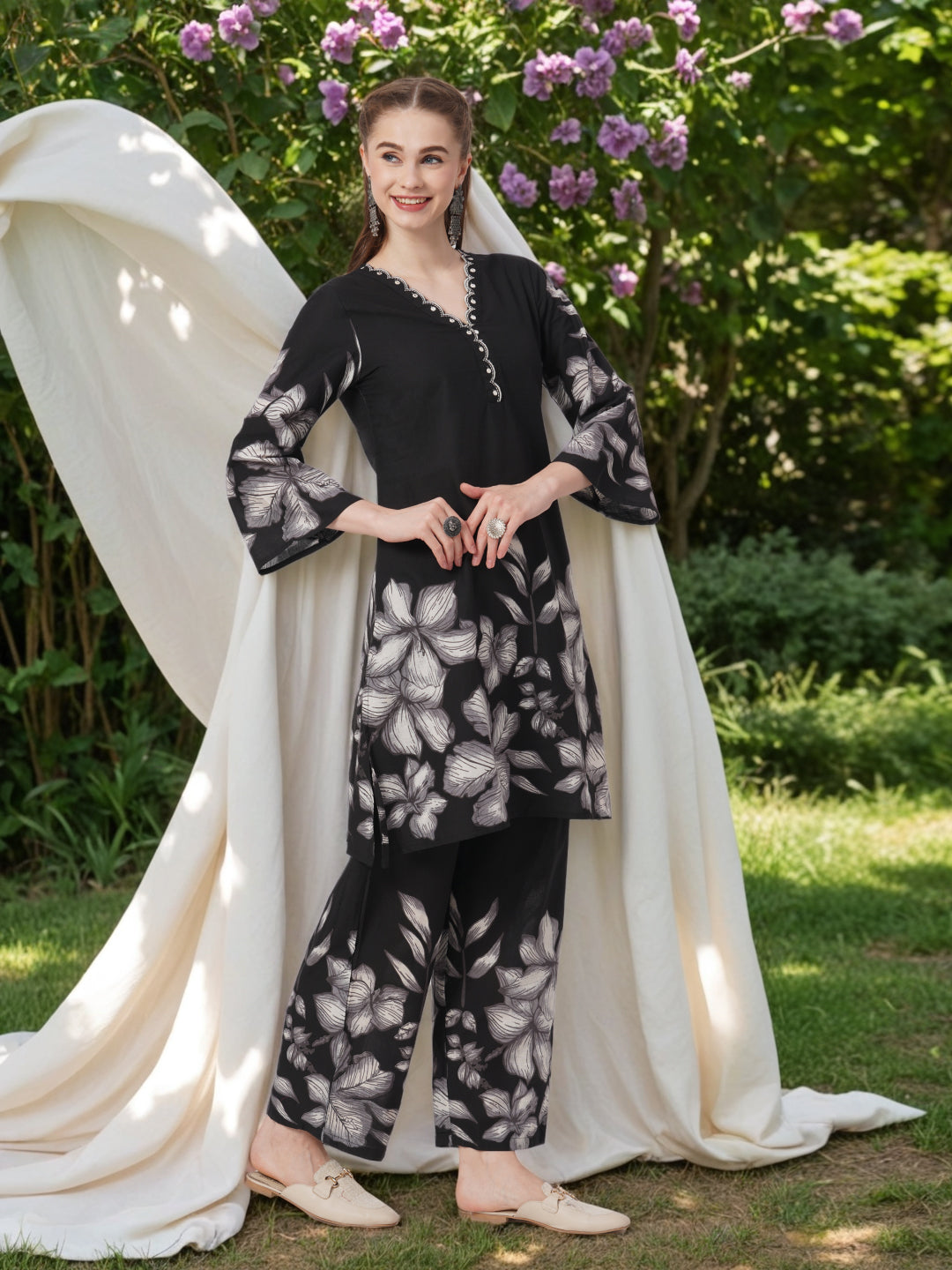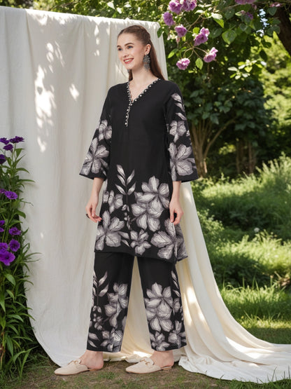 Abstract Floral Printed Mirror Work Straight Fit Co-ord Set - Black
