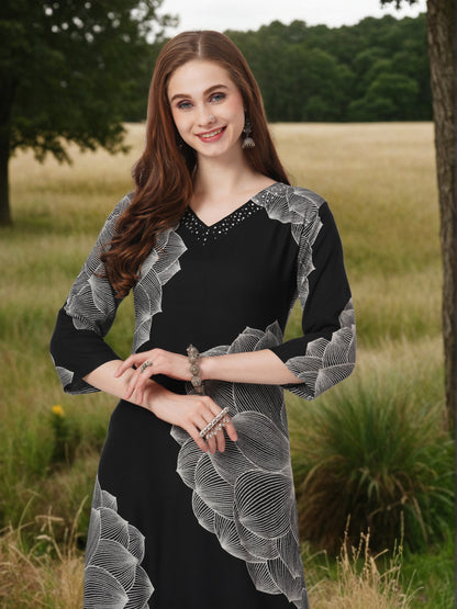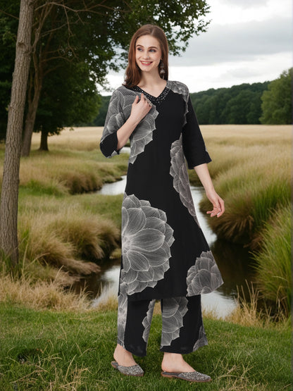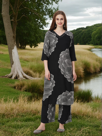 Turn heads in this Black Abstract Floral Printed & Embroidered Co-ord Set, crafted from luxe viscose rayon for a soft, fluid drape. Featuring all-over abstract floral prints, a flattering V-neckline adorned with delicate sequin and beadwork, this straight-fit ensemble adds a touch of sparkle to effortless elegance.