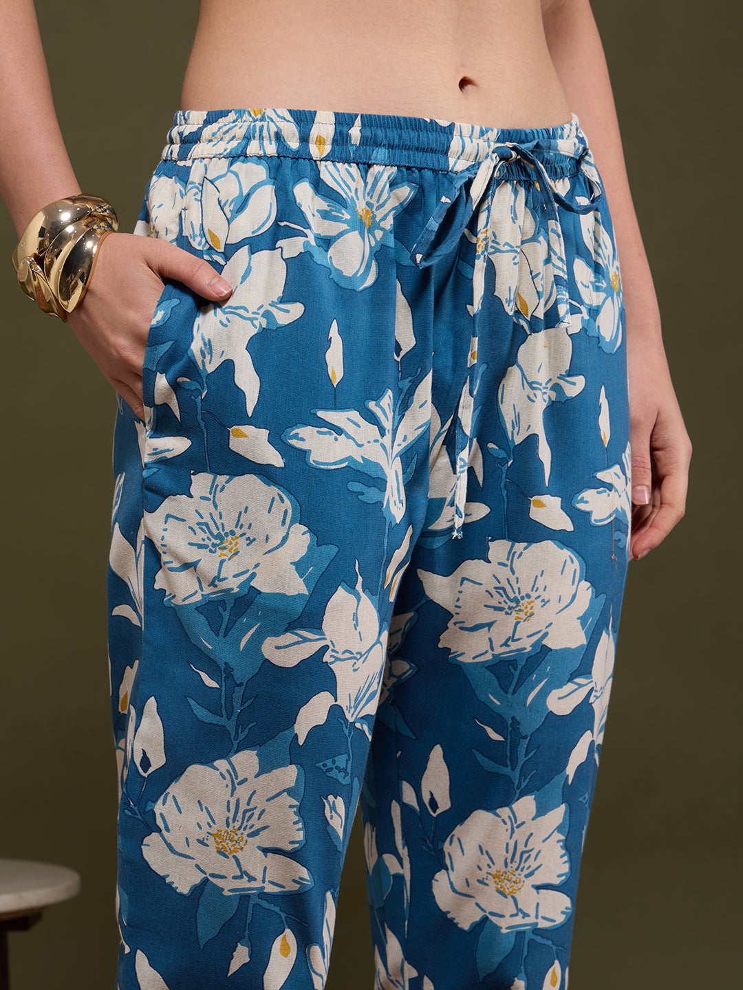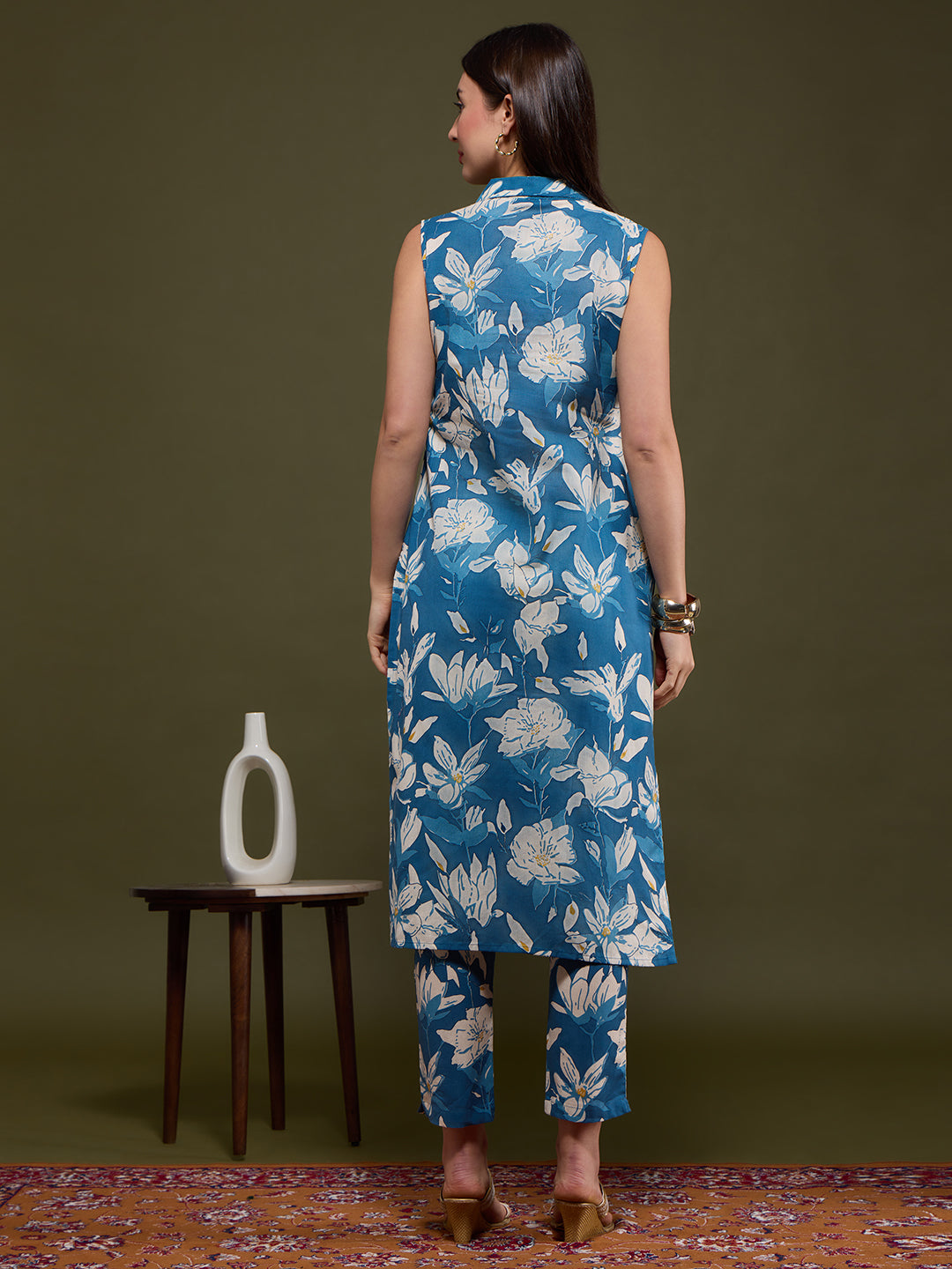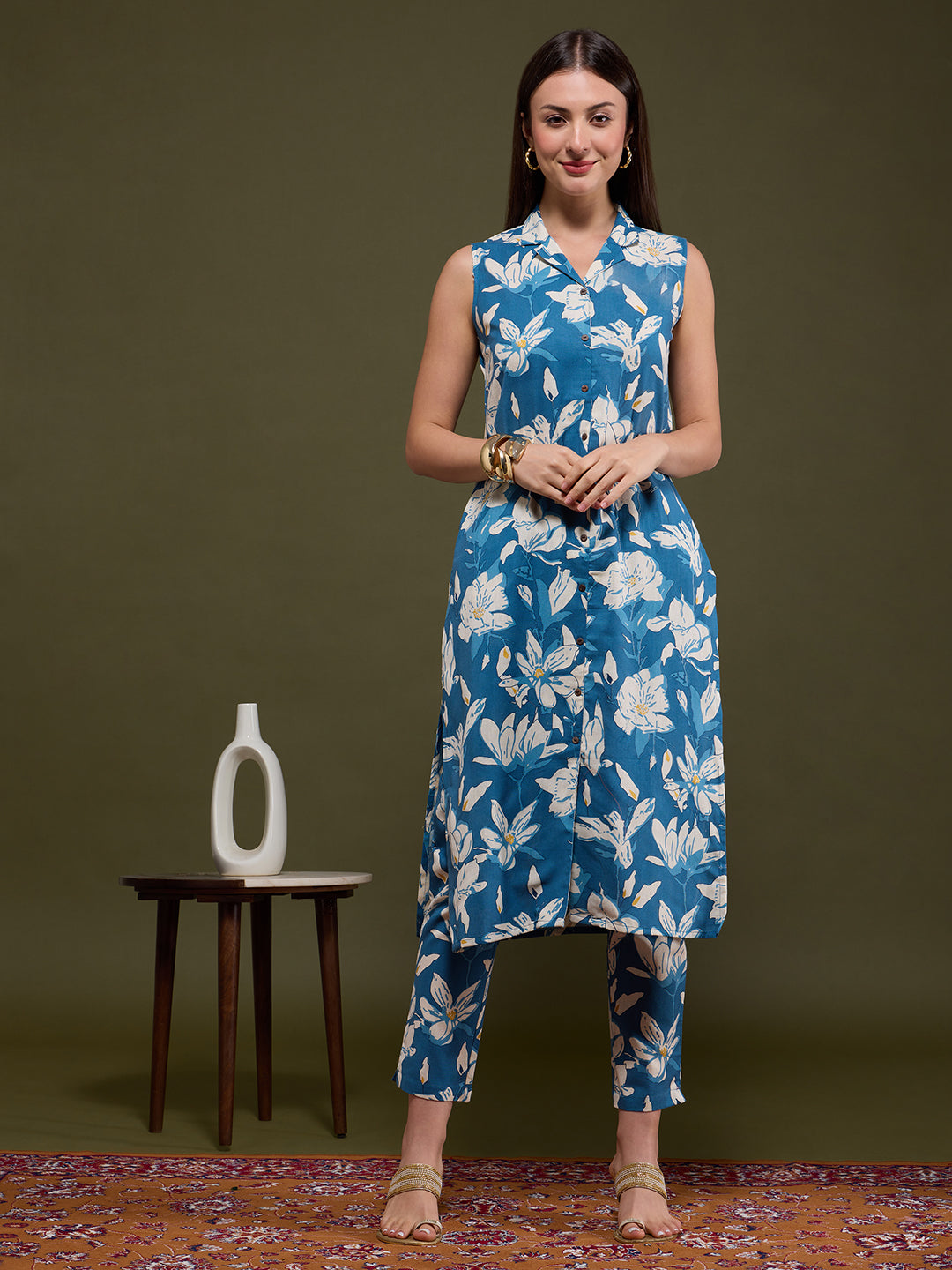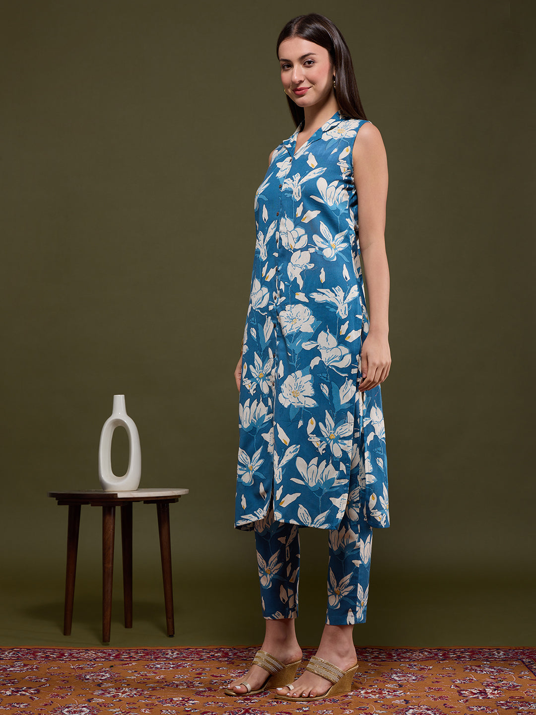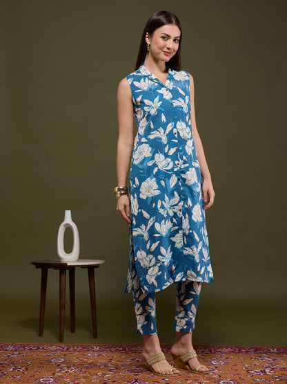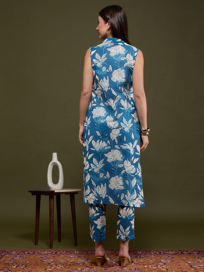 Infuse artisanal elegance into your wardrobe with this Blue Abstract Floral Printed Straight Fit Co-ord Set. Tailored from breathable cotton flax, it features a sophisticated lapel collar and is paired with a coordinated pant for effortless style. Provided with Detachable Sleeves inside the Garment. The intricate Abstract -inspired print adds a touch of heritage charm to this contemporary silhouette—perfect for chic daywear or relaxed gatherings.