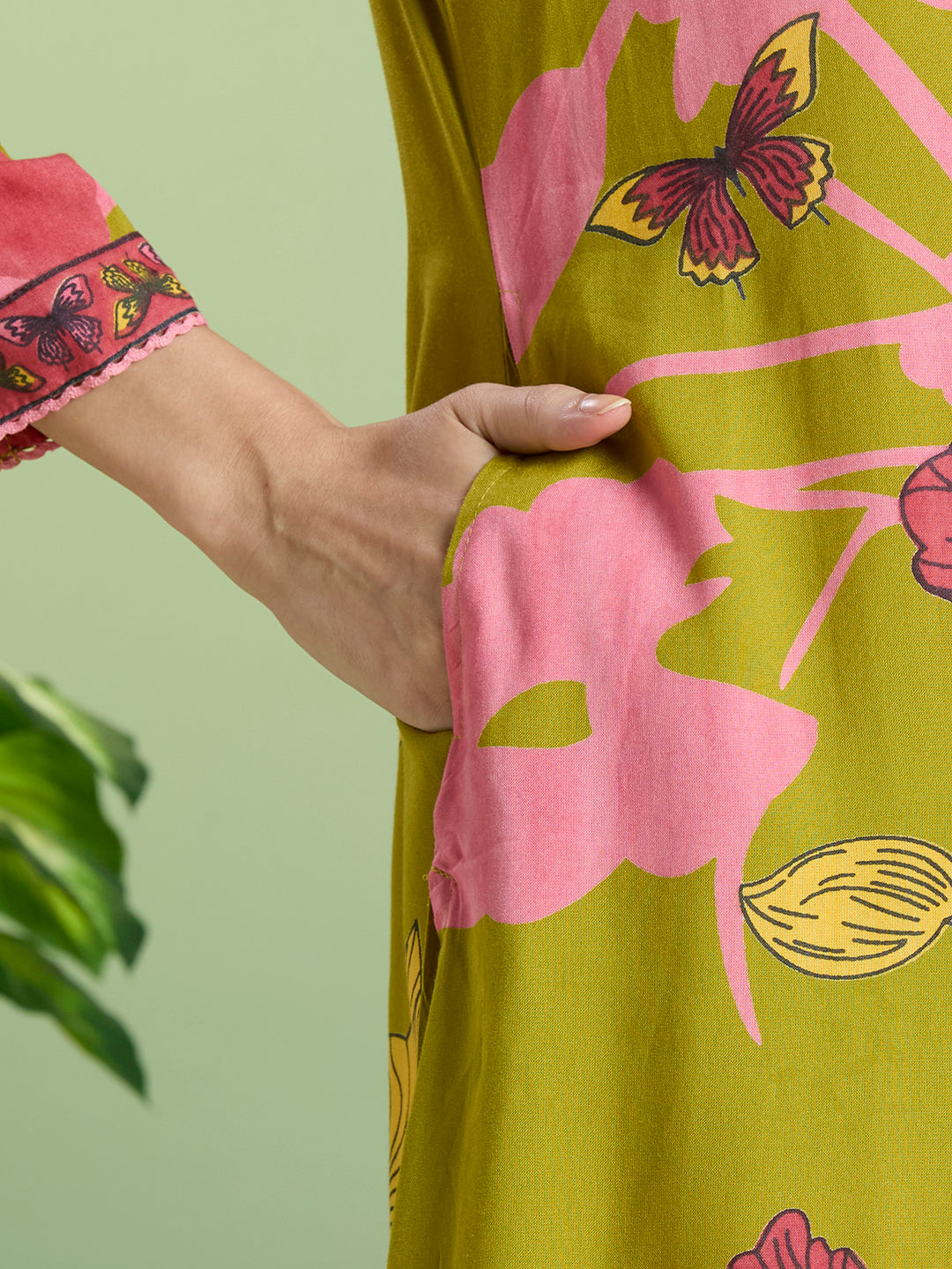 Abstract Floral Printed Straight Fit Co-ord Set - Lime Green