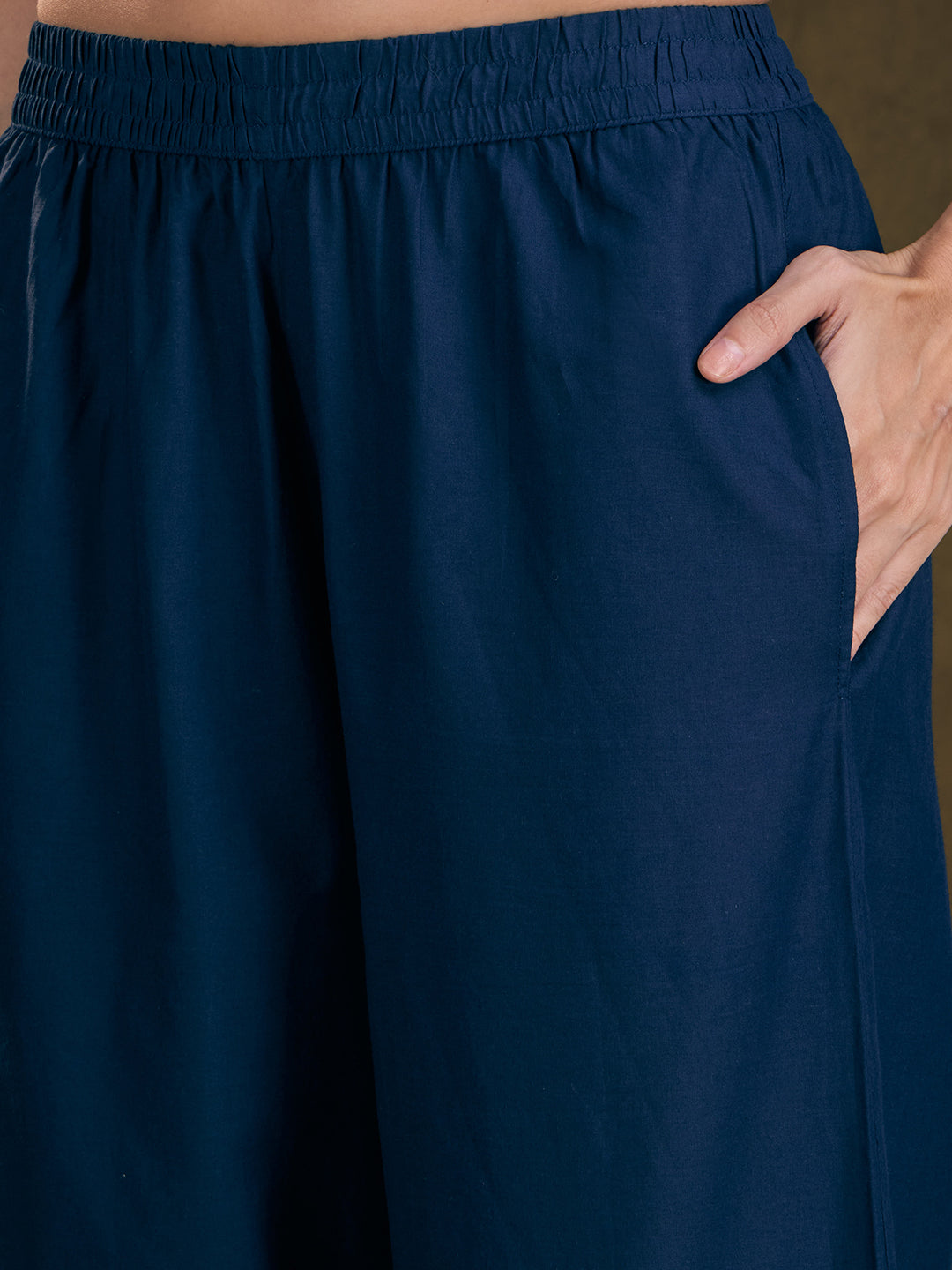 Elevate your everyday elegance with this Abstract Floral Printed Co‑ord Set in refreshing Navy Blue cotton. The top features a graceful V‑neckline with delicate kantha embroidery, enhanced by subtle pin‑tuck detailing and a whisper of sequin shimmer—perfect for adding a refined sparkle to your look. Adorned with bold abstract floral prints, it beautifully contrasts with the solid, straight‑fit palazzo trousers. Crafted from breathable cotton, this ensemble promises both comfort and style—ideal for daytime outings or casual soirées with a chic, artistic flair.