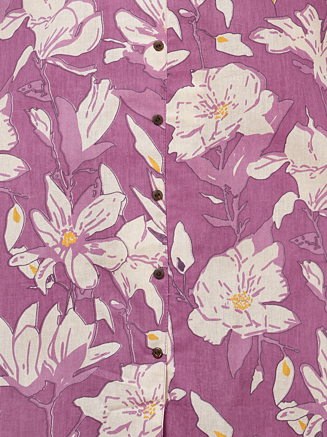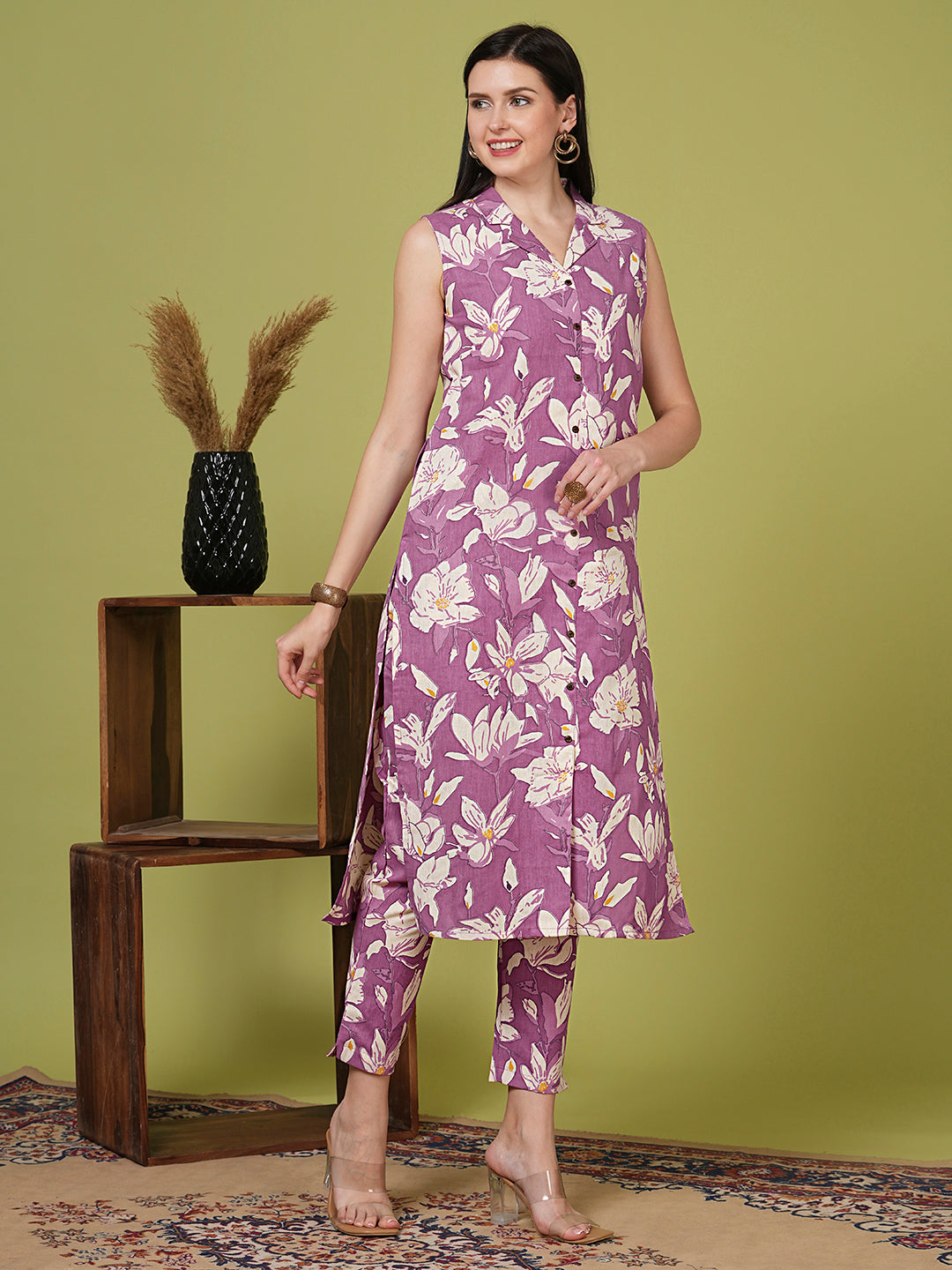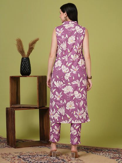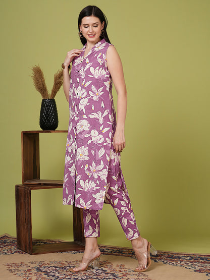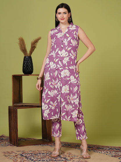 Abstract Floral Printed Straight Fit Co-ord Set - Purple