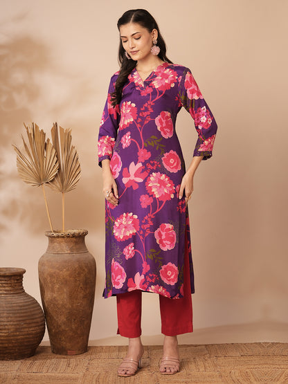 Abstract Floral Printed Straight Fit Kurta - Purple