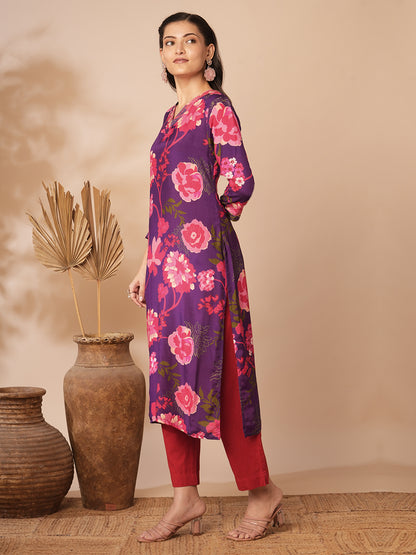 Floral Printed Embroidered Straight Fit Kurta -...