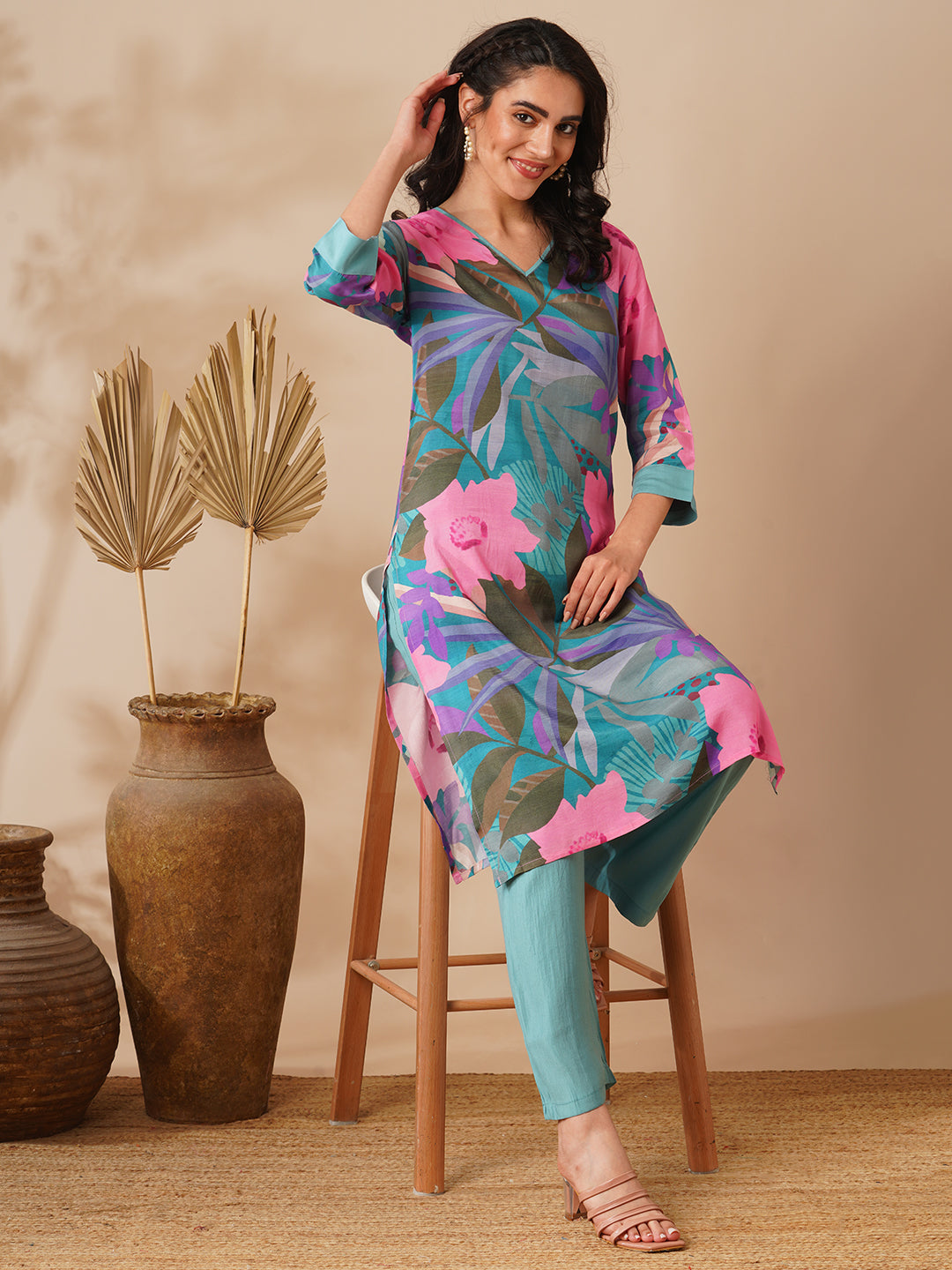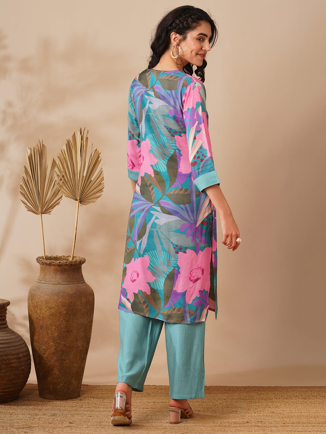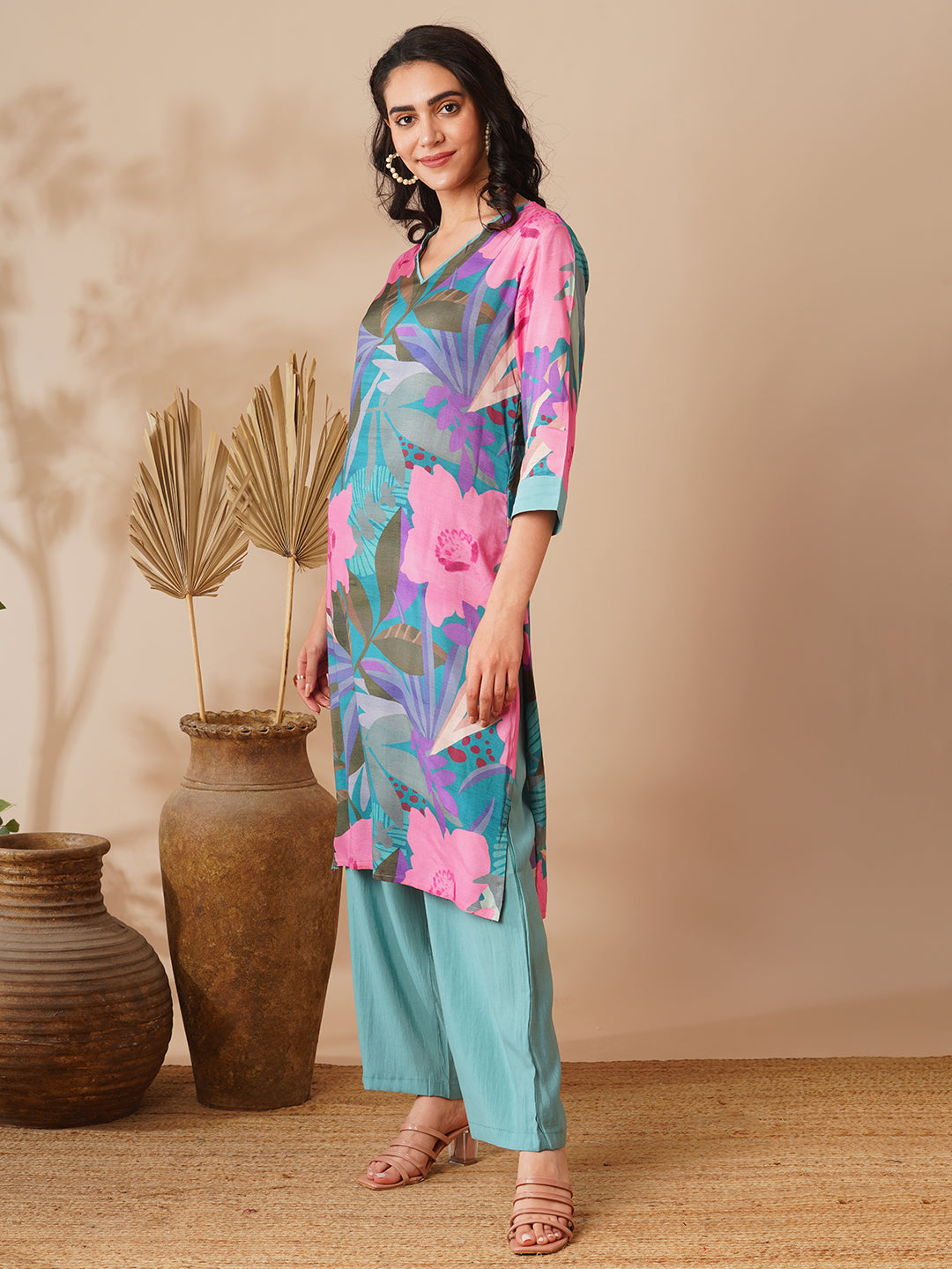 Abstract Floral Printed Straight Fit Kurta with Palazzo- Multi