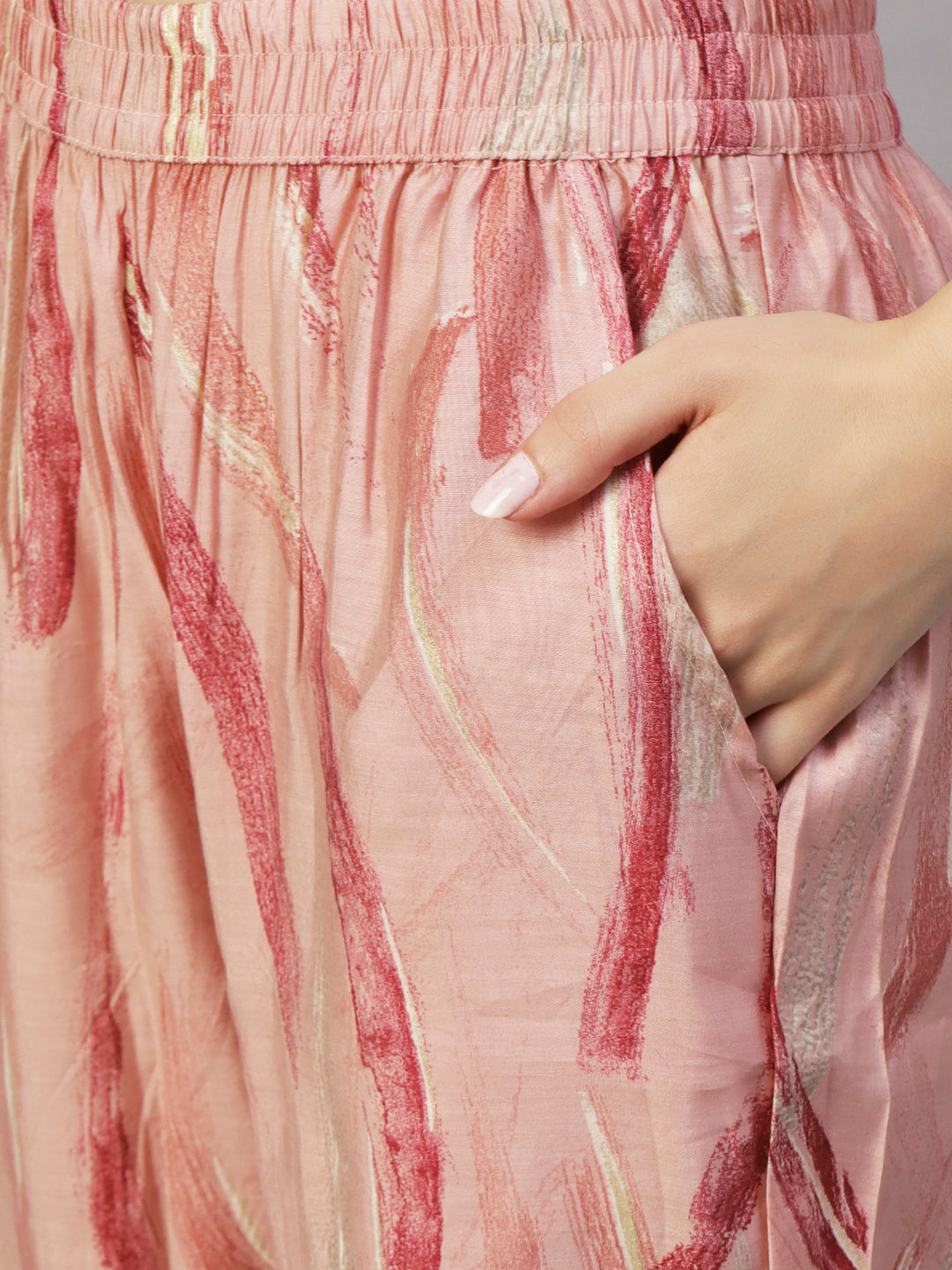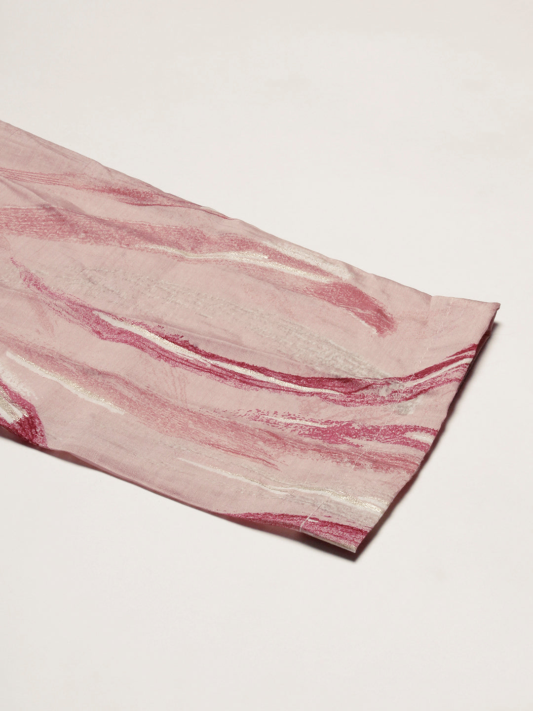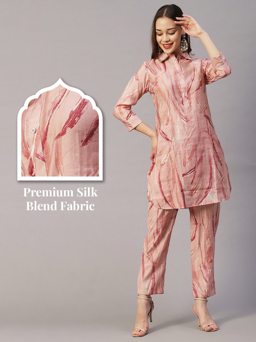 Abstract Foil Printed Sequins & Beads Embroidered Kurta With Pants Set - Pink