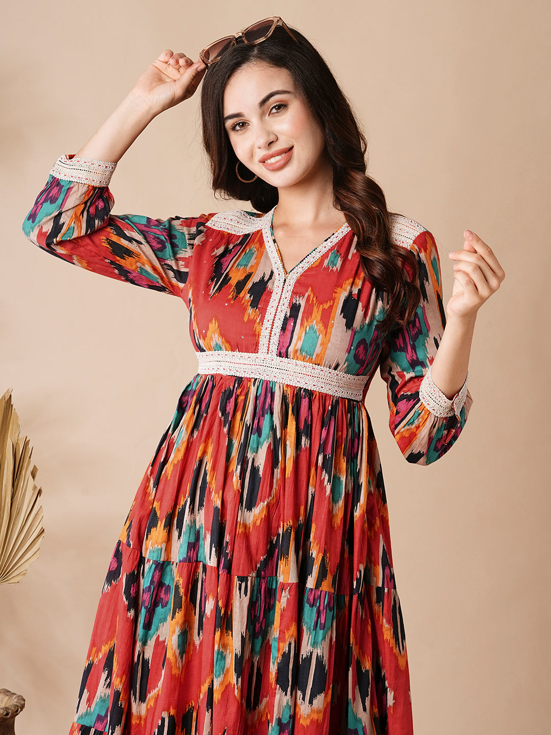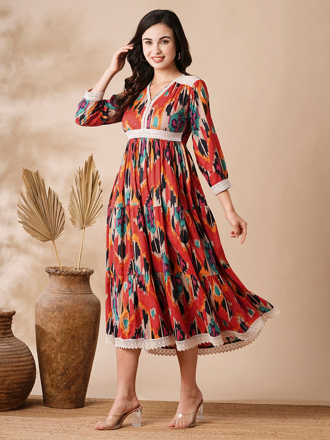 Abstract Ikat Style Printed Resham & Crochet Lace Embellished Dress - Red & Multi