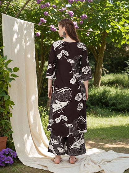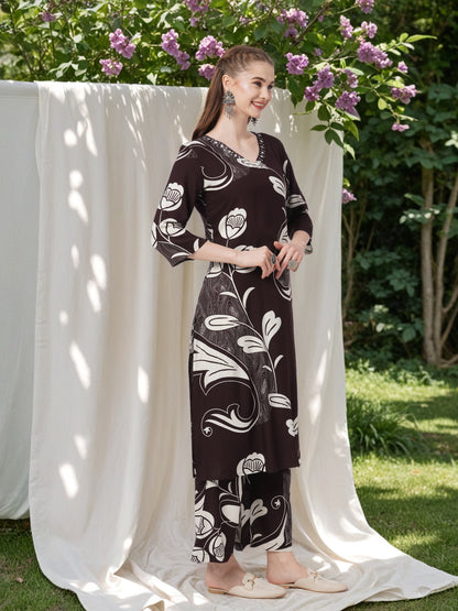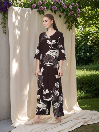 -Turn heads in this Burgundy Abstract Leaf Printed & Embroidered Co-ord Set, crafted from luxe viscose rayon for a soft, fluid drape. Featuring all-over abstract floral prints, a flattering V-neckline adorned with delicate sequin and beadwork, this straight-fit ensemble adds a touch of sparkle to effortless elegance.