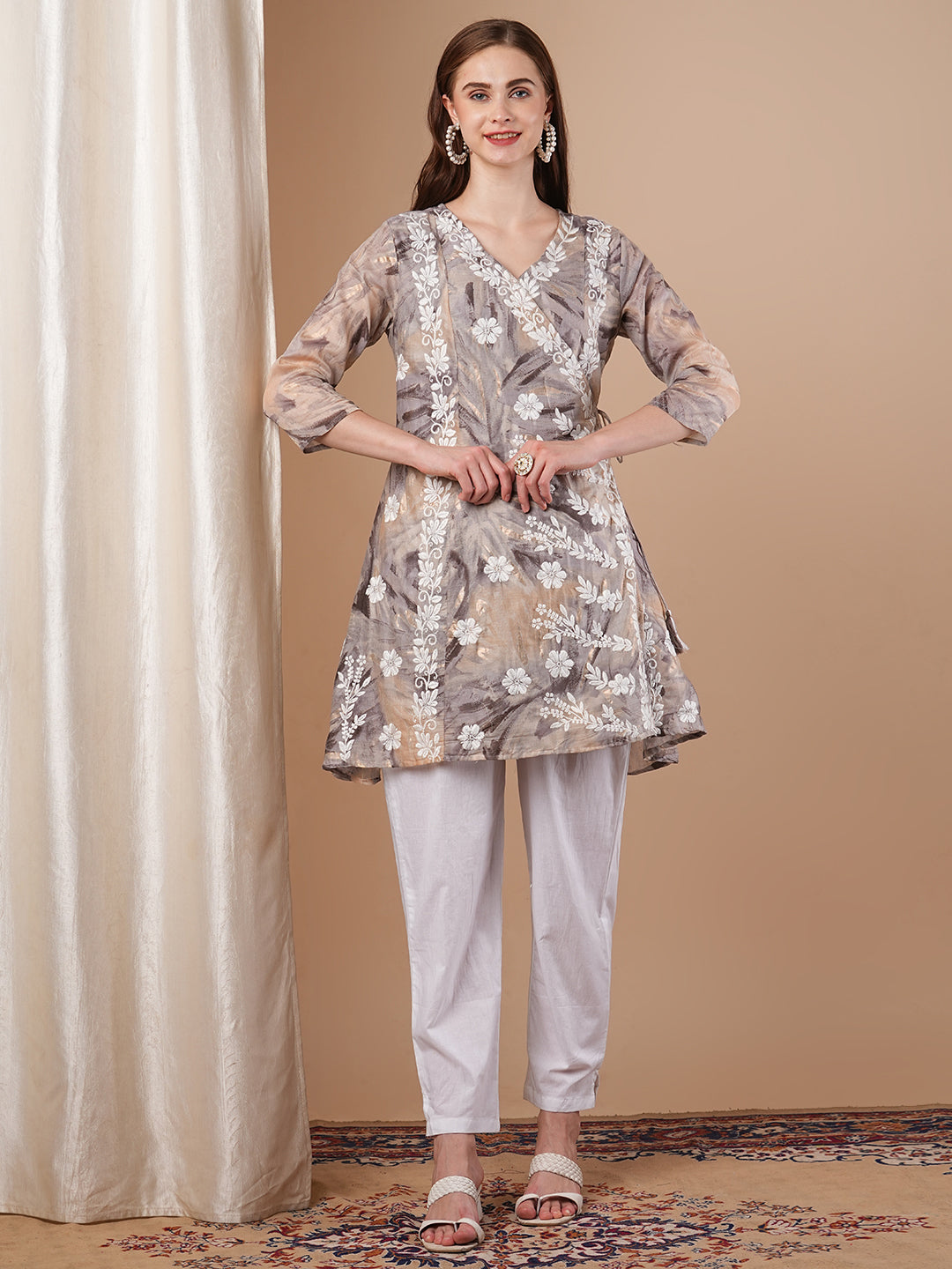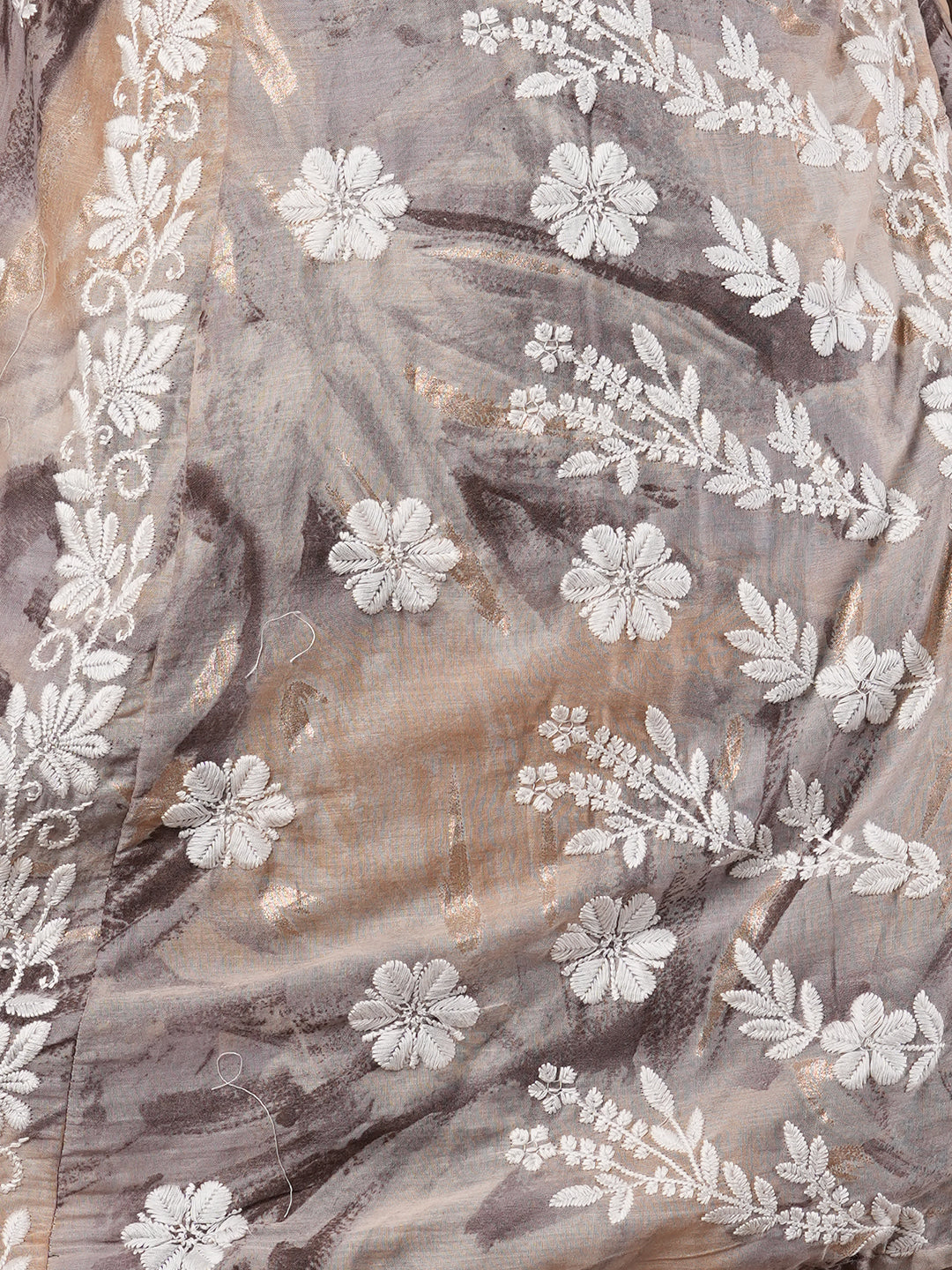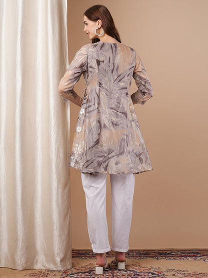 Abstract Printed & Chikankari Work Angrakha Style Kurta with Pant - Taupe