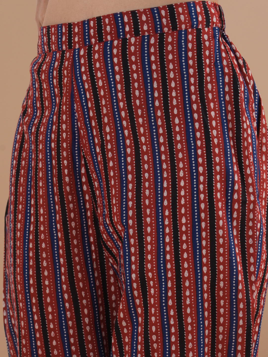This anarkali flared kurta with ajrakh prints all over and sequin highlight at yoke, paired with striped pant and pure cotton printed dupatta is a perfect everyday summer wear.