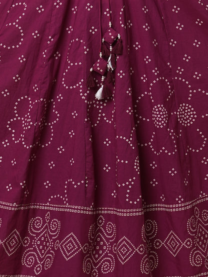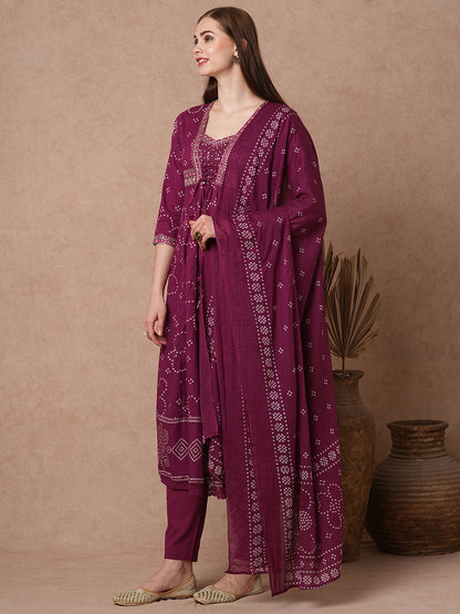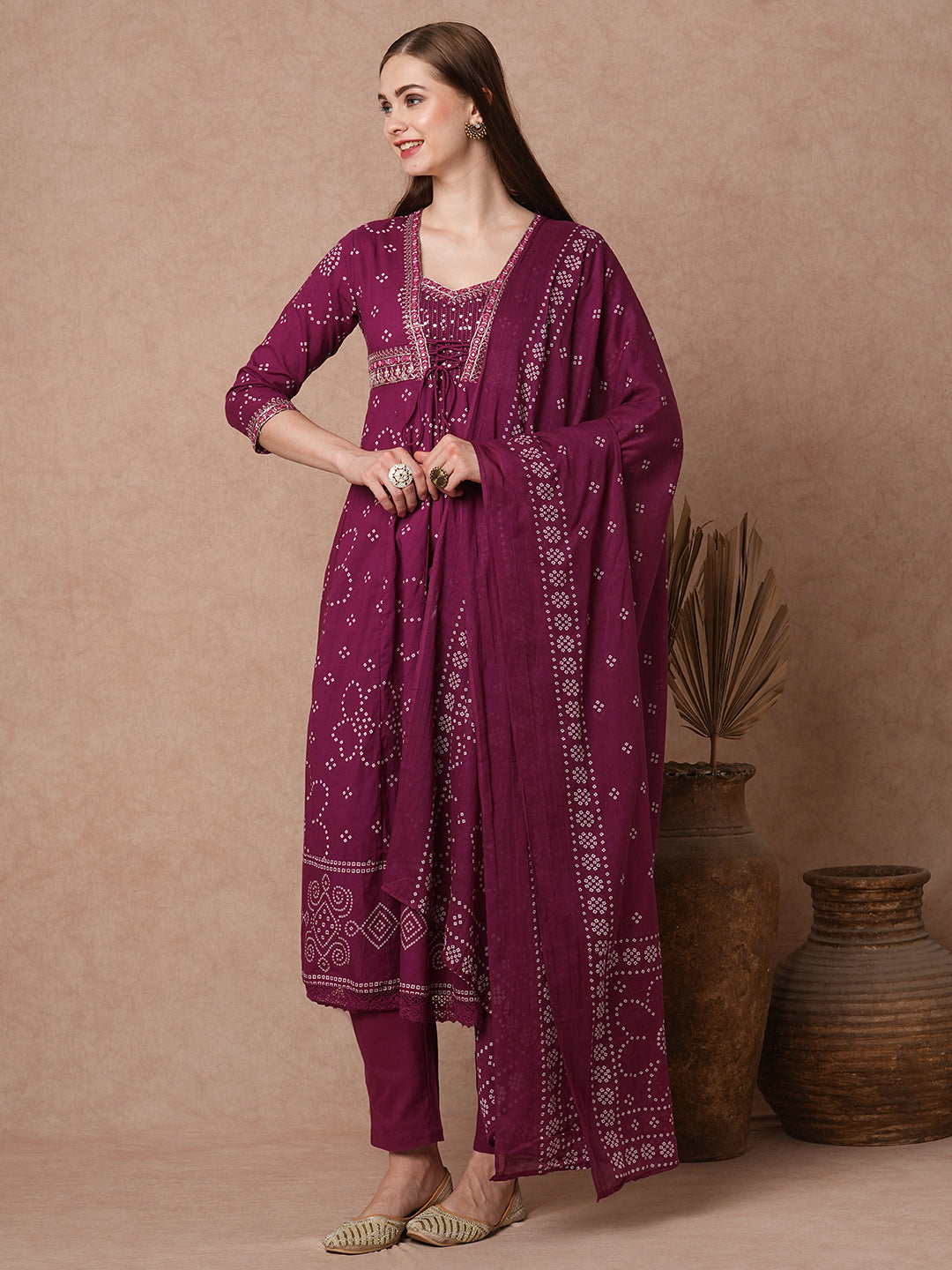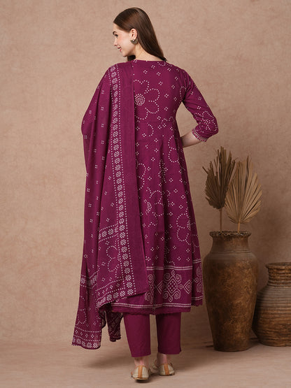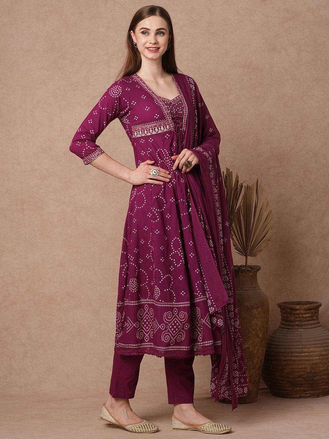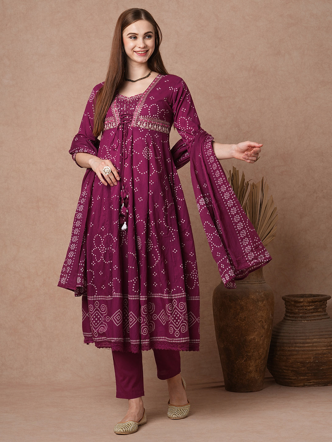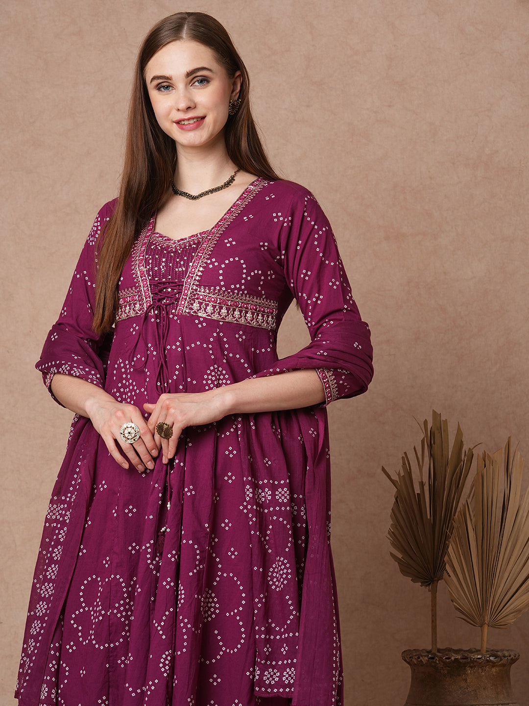 Ethnic Bandhani Printed & Embroidered Anarkali Kurta Set - Burgundy