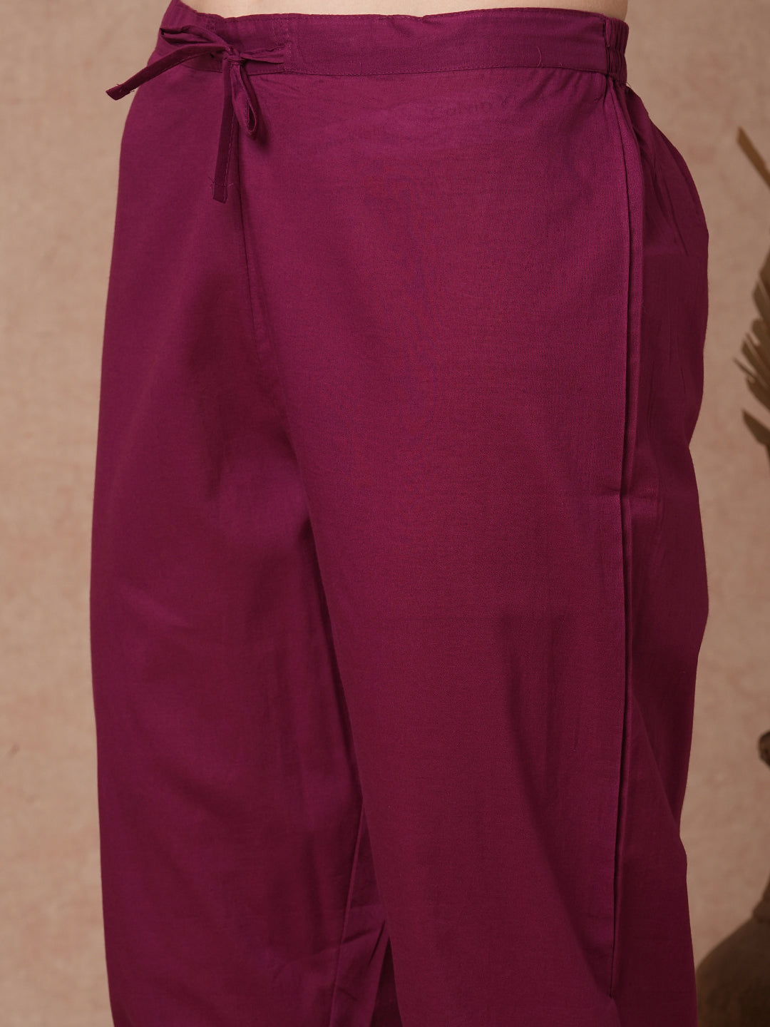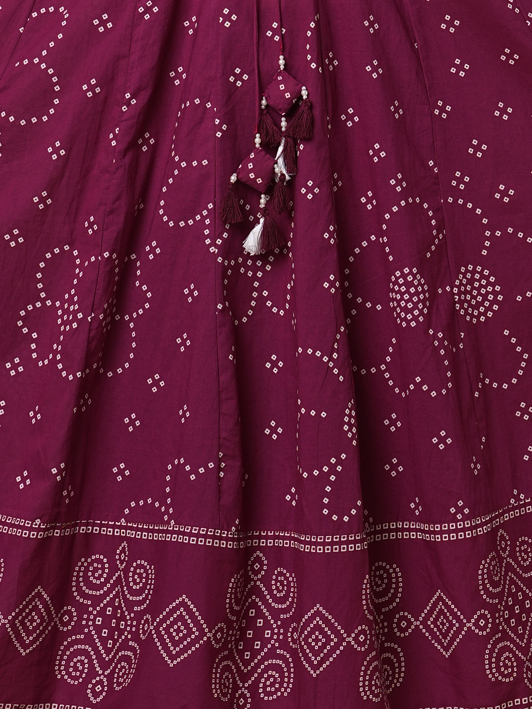 Radiate festive charm in our Ethnic Bandhani Printed & Embroidered Anarkali Kurta Set in deep burgundy. Made from soft cotton, the flared kurta features traditional Bandhani prints and is highlighted with intricate zari and sequin embroidery on the yoke. Completed with a solid pant and a pure cotton printed dupatta, this ensemble is perfect for timeless ethnic elegance.