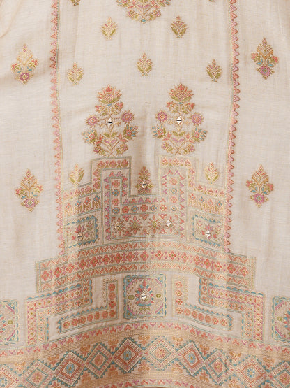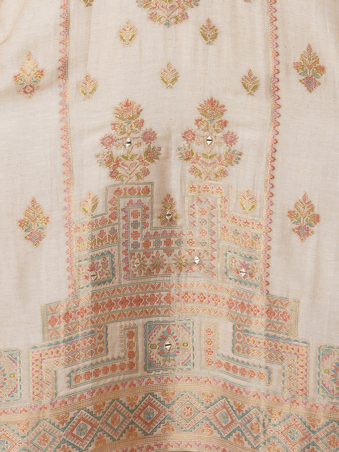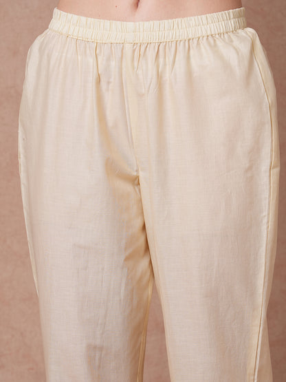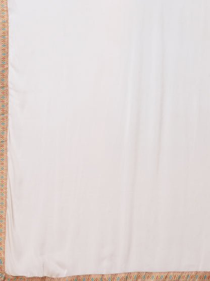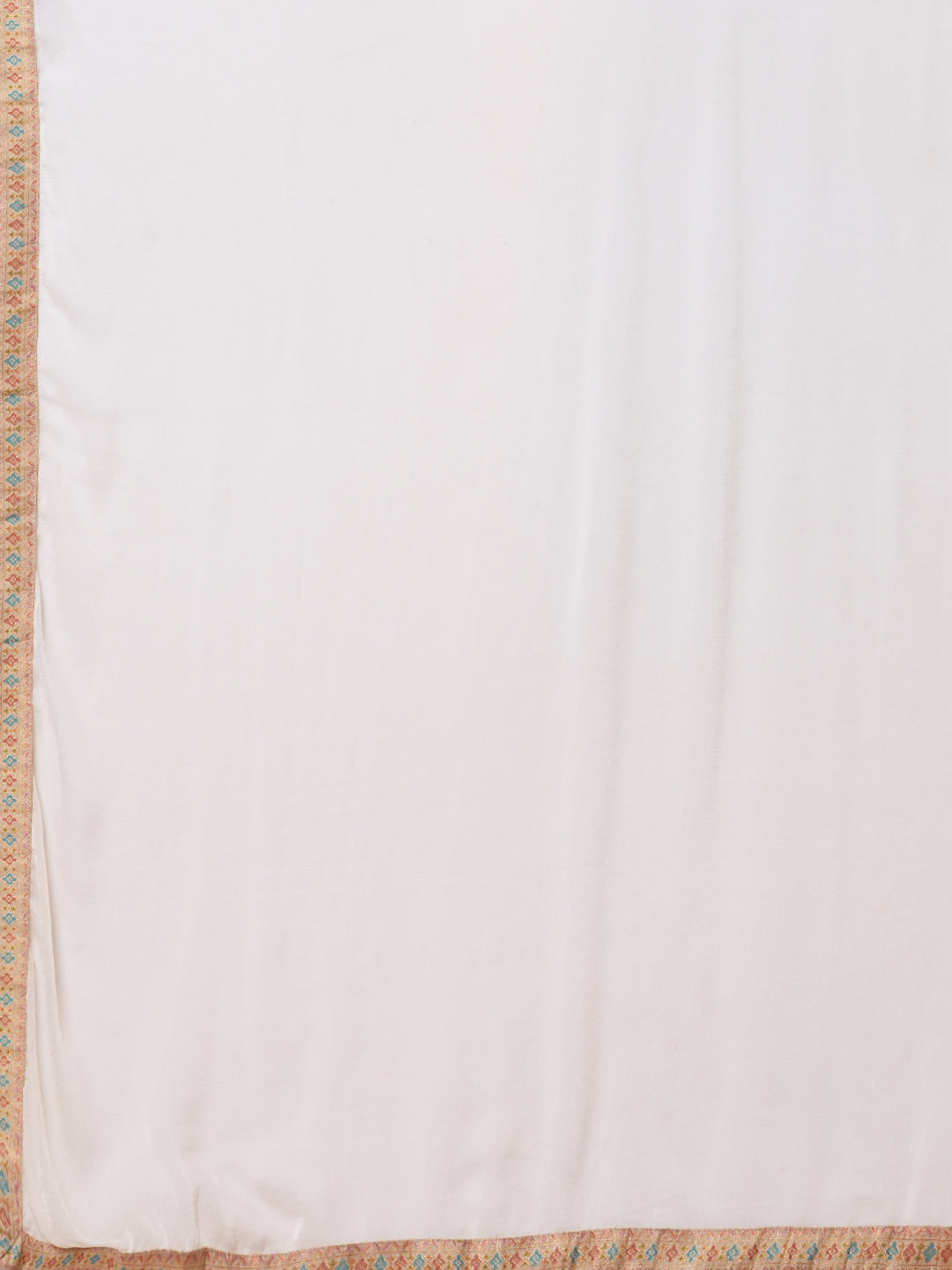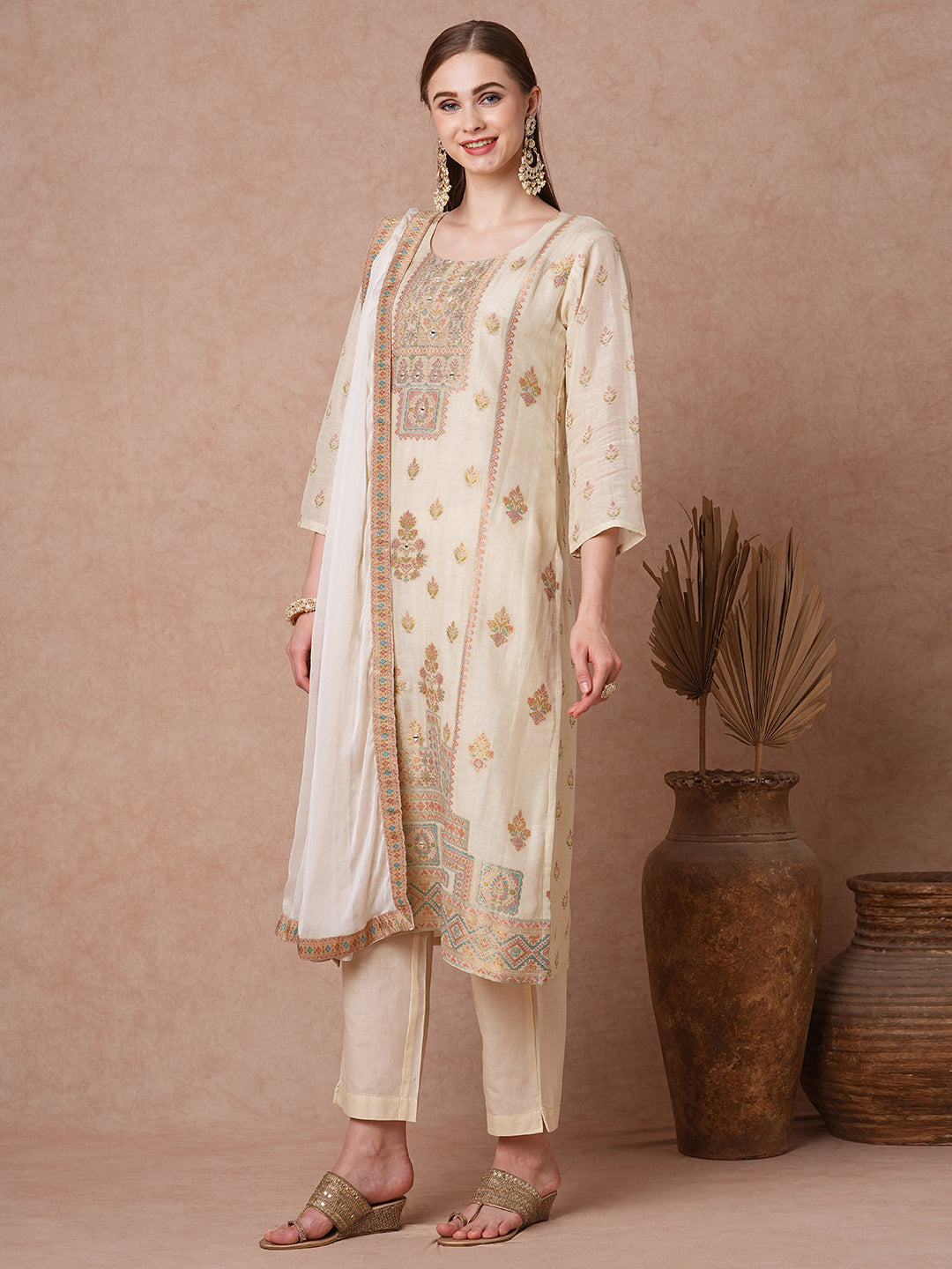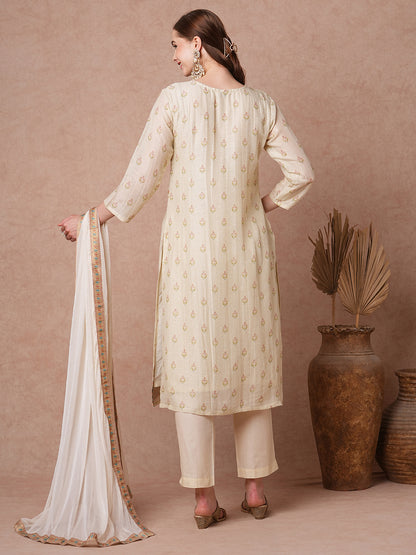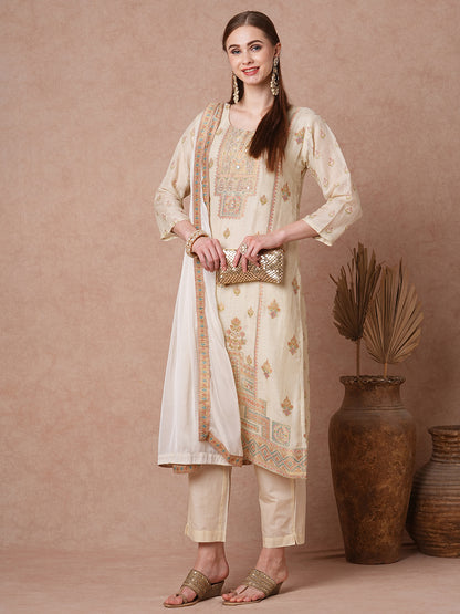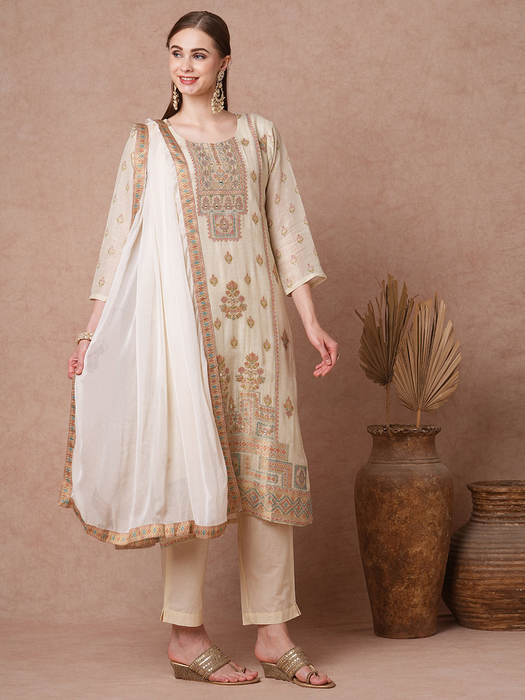 Ethnic Embroidered Jacquard Straight Cut Kurta with Pant and Dupatta - Cream