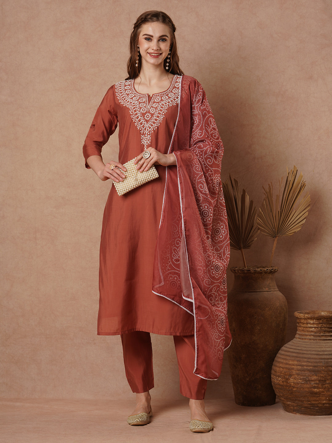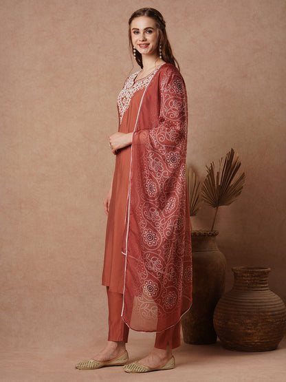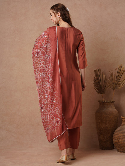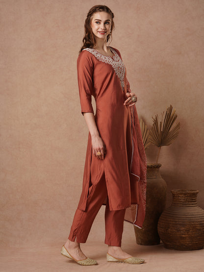 Ethnic Embroidered Straight Cut Kurta with Pant and Printed Dupatta - Rust