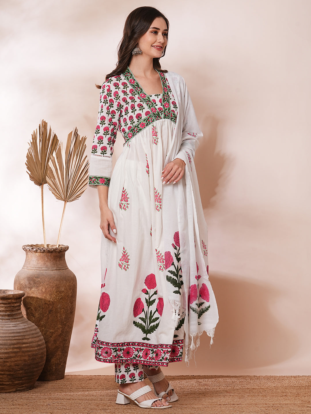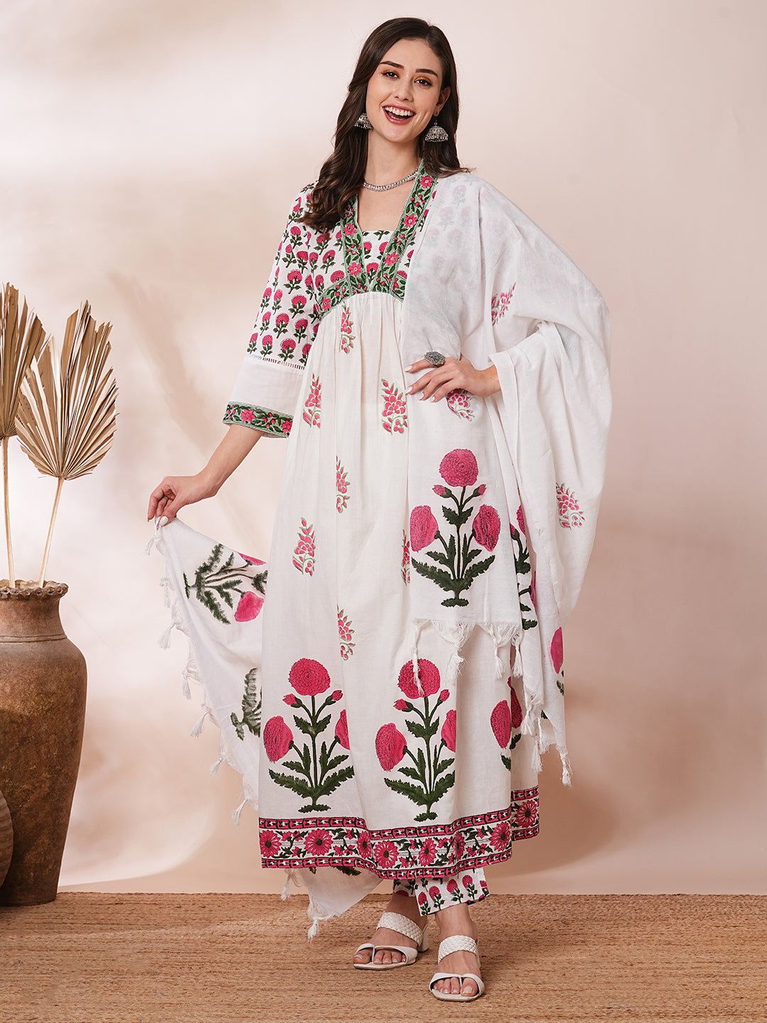 Ethnic Floral Block Printed A-Line Pleated Kurta with Pant and Printed Dupatta - White
