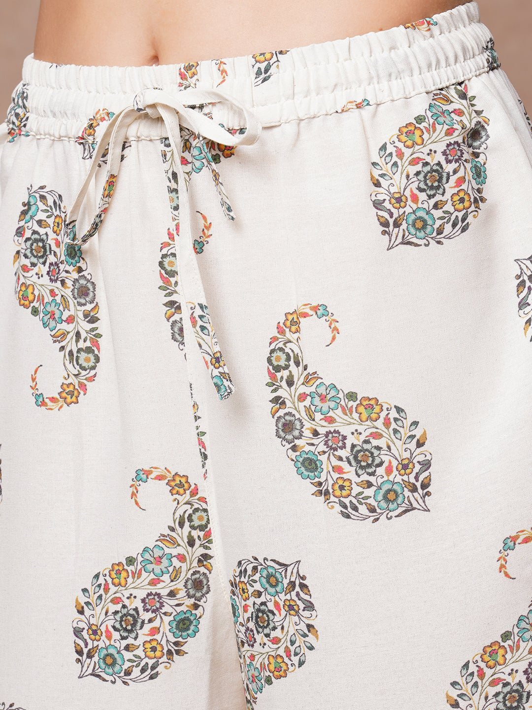 This straight fit kurta with ethnic floral embroidered yoke and pin tucks detailing all over,paired with printed palazzo is a perfect fit for everyday wear.