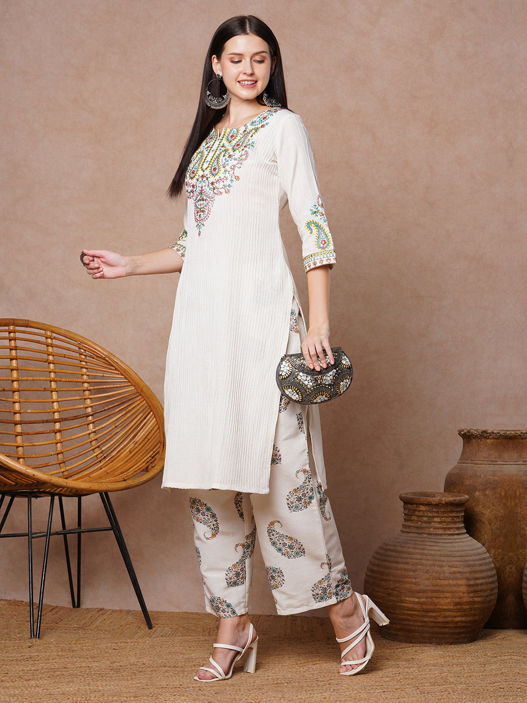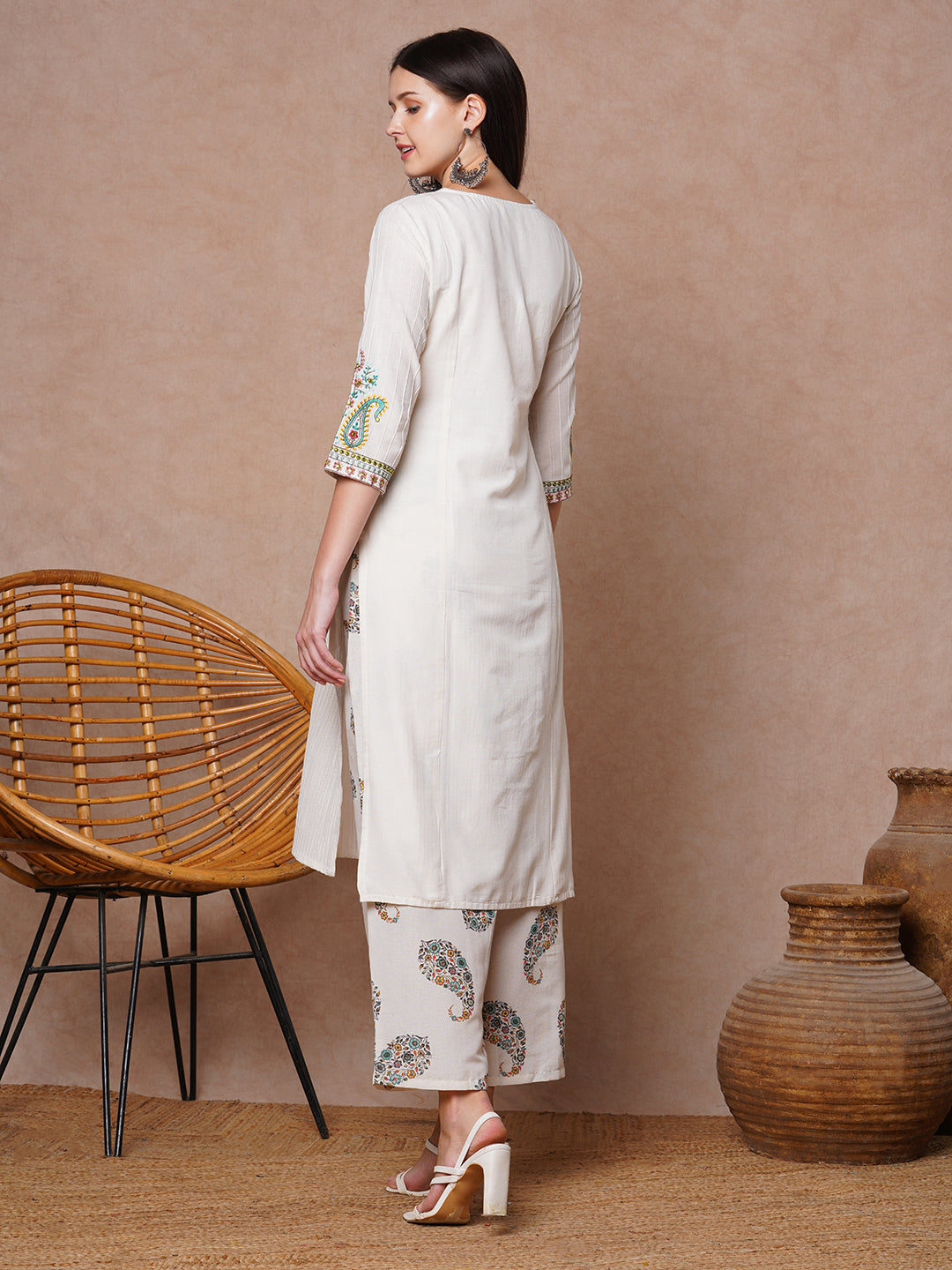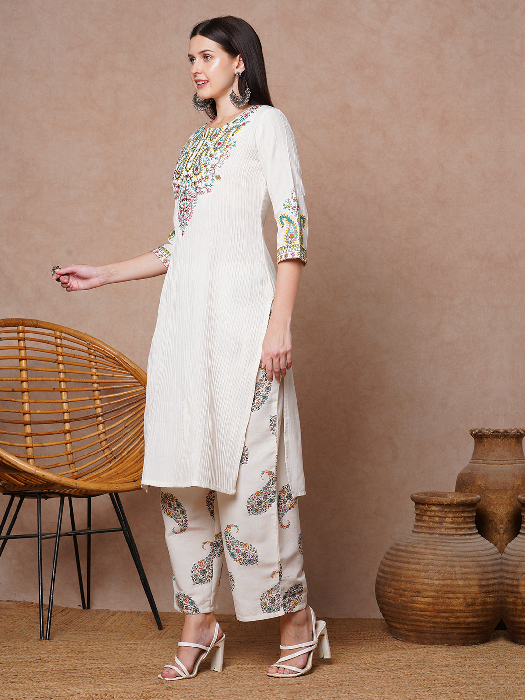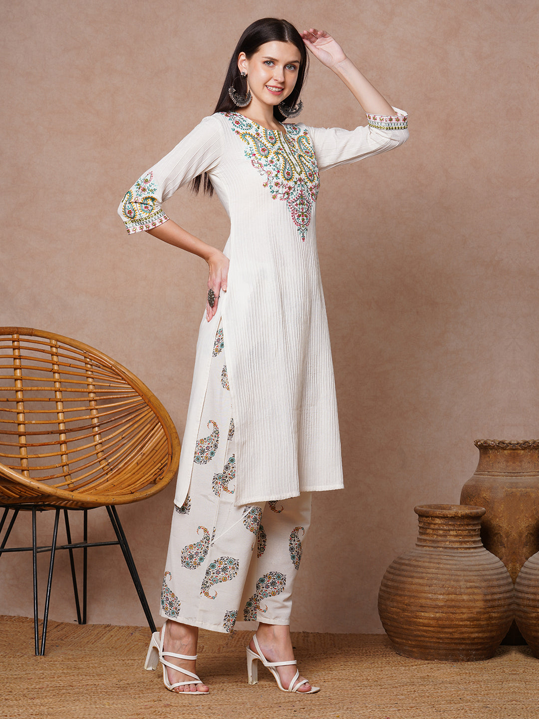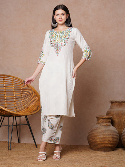 Ethnic Floral Embroidered Straight Fit Kurta with Palazzo - Off White