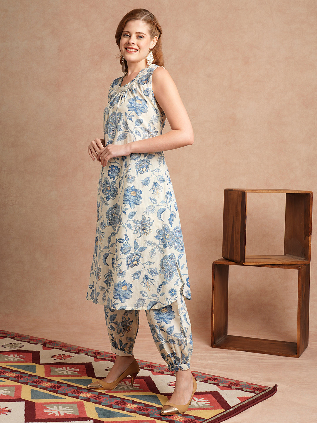 Ethnic Floral Foil Printed Straight Fit Co-ord Set - Off White
