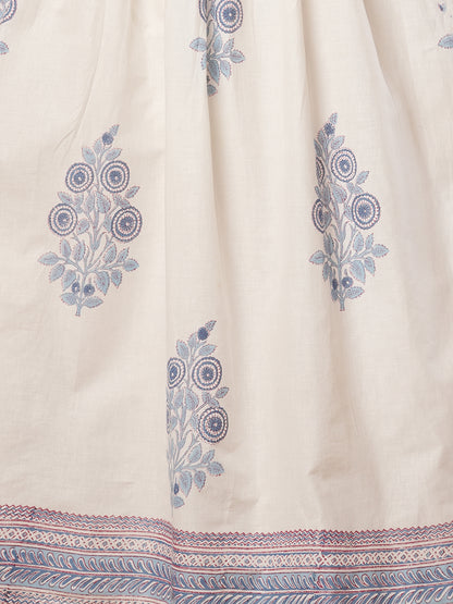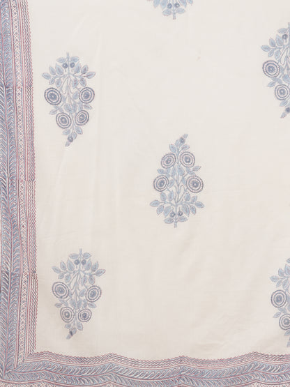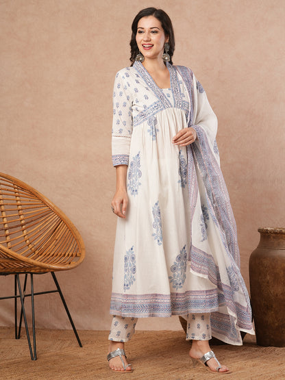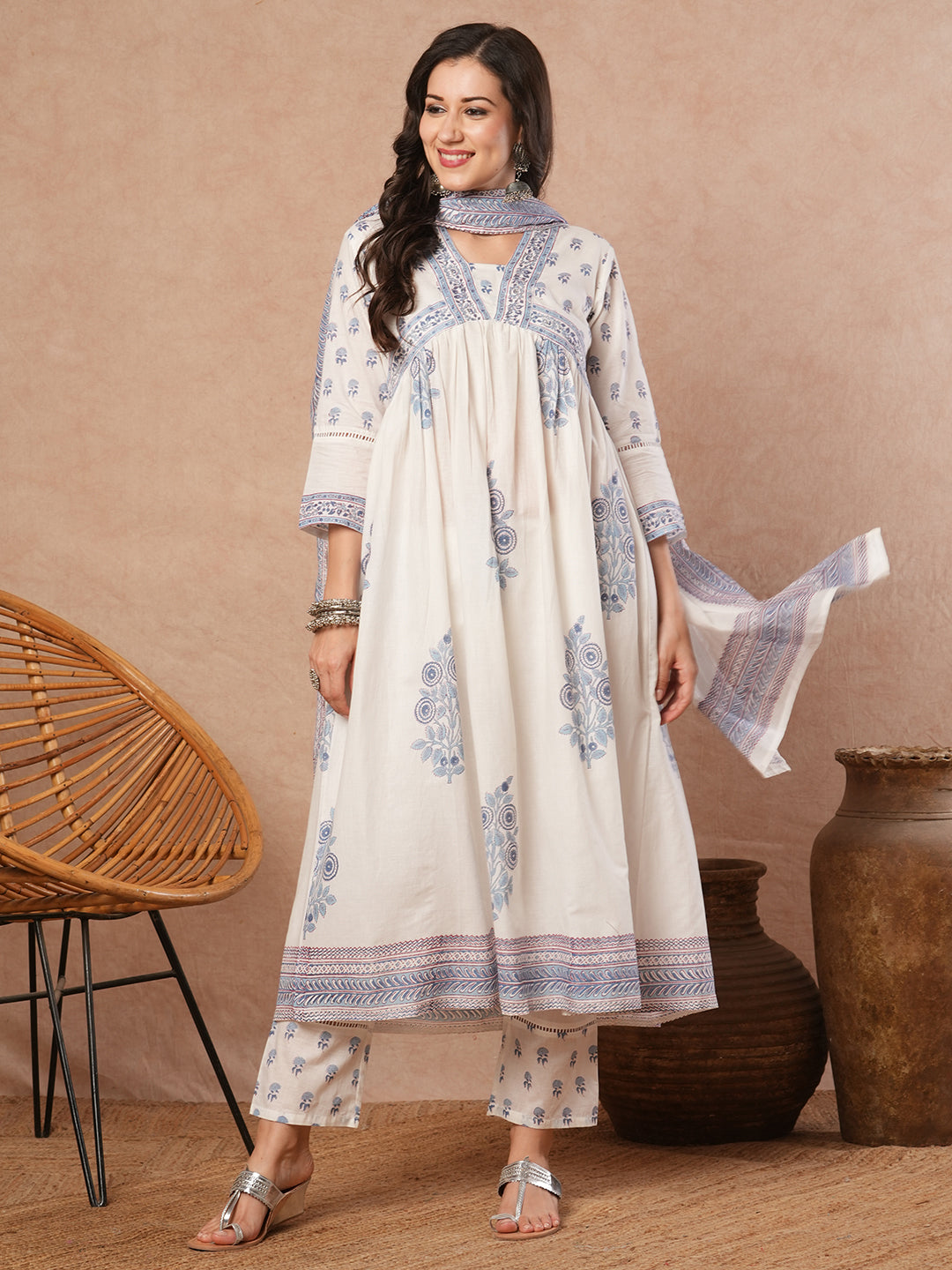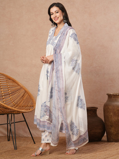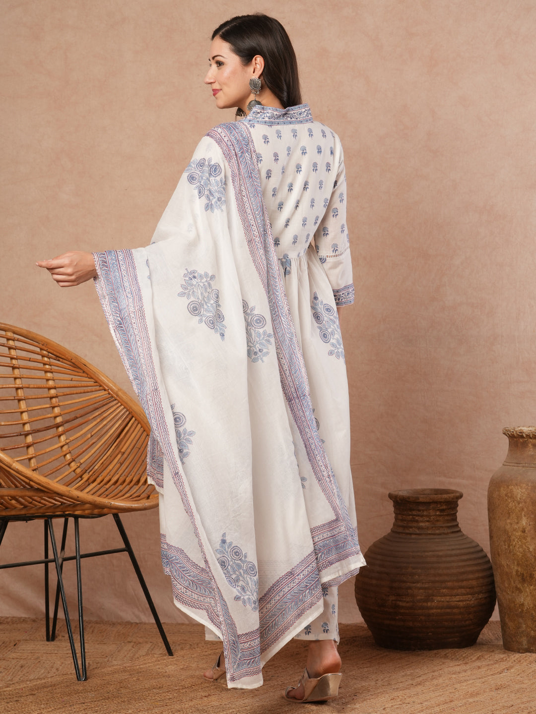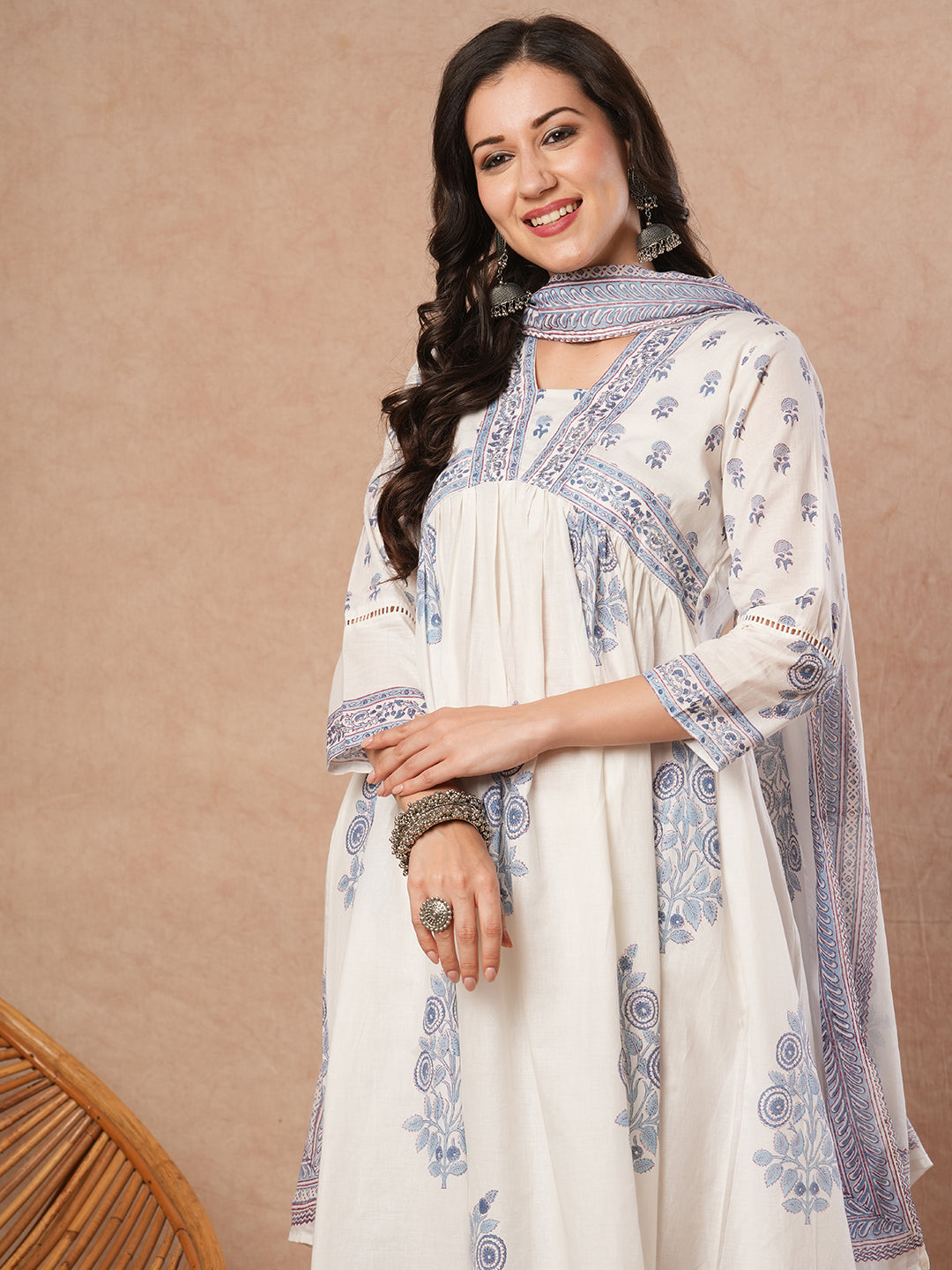Ethnic Floral Printed A-Line Pleated Kurta with Pant & Dupatta - White