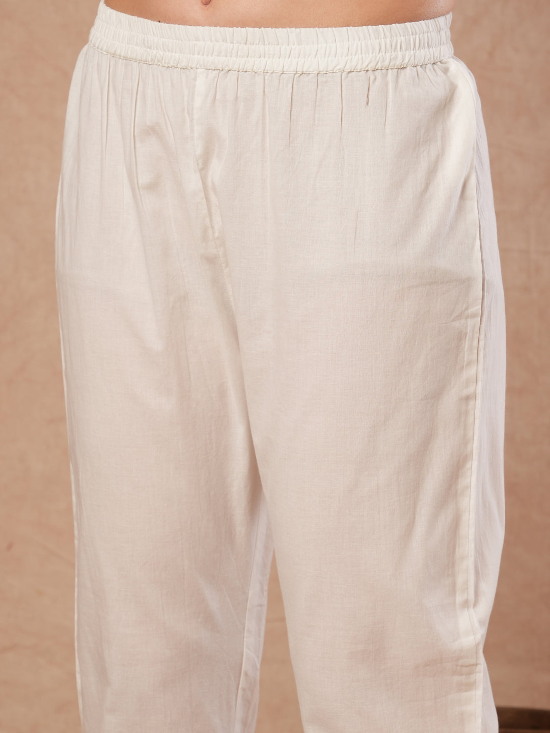 This White Ethnic Floral Printed A-Line Pleated Kurta Set is a harmonious blend of traditional artistry and contemporary elegance. Crafted from breathable cotton, the kurta features a flattering V-neckline adorned with delicate sequin highlights, adding a touch of sparkle to its intricate floral print. The A-line silhouette gracefully flows into pleated detailing, enhancing its feminine charm. Paired with a printed pant and a pure cotton dupatta, this ensemble offers a cohesive and stylish look. Perfect for festive occasions or casual gatherings, this set embodies timeless beauty and comfort.