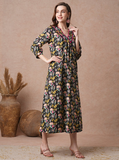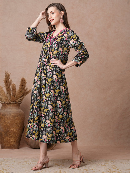 Ethnic Floral Printed A-Line Pleated Maxi Dress - Black