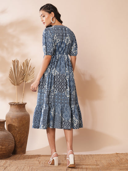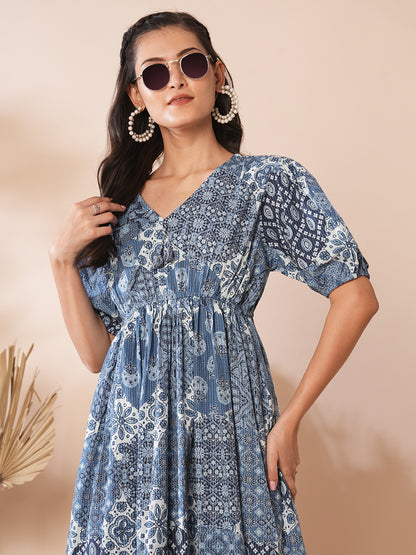 Ethnic Floral Printed A-Line Pleated Midi Dress - Blue